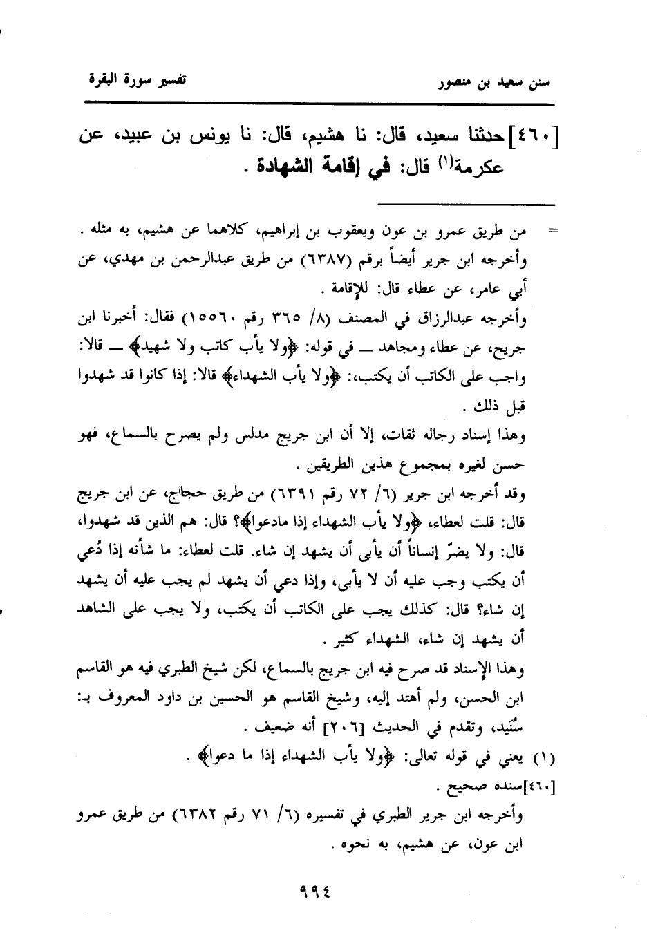 ٤٦٠ - حَدَّثَنَا سَعِيدٌ، قَالَ: نا هُشَيْمٌ، قَالَ: نَا يُونُسُ بْنُ عُبَيْدٍ، عَنْ عِكْرِمَةَ (¬١) قَالَ: فِي إِقَامَةِ الشهادة.