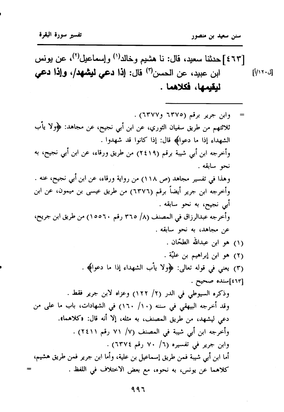 ثلاثتهم من طريق سُفْيَانَ الثَّوْرِيِّ، عَنِ ابْنِ أَبِي نجيح، عن مجاهد: {وَلَا يَأْبَ الشُّهَدَاءُ إِذَا مَا دعوا} قال: إذا كانوا قد شهدوا.