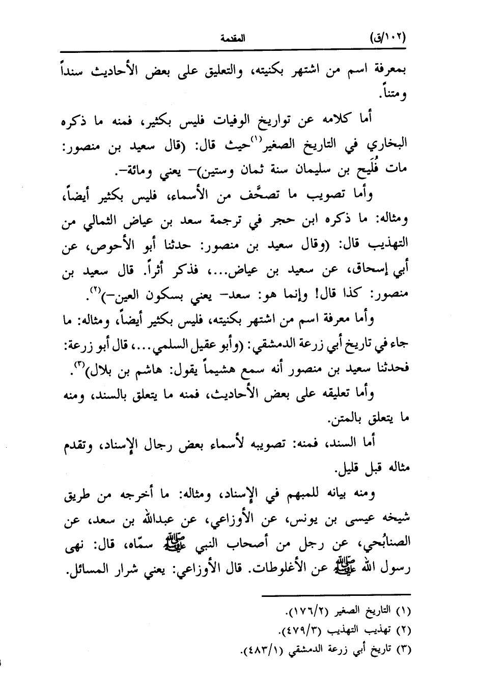 وأما تصويب ما تصحَّف من الأسماء، فليس بكثير أيضاً، ومثاله: ما ذكره ابن حجر في ترجمة سعد بن عياض الثمالي من التهذيب قال: (وقال سعيد بن منصور: حدثنا أَبُو الْأَحْوَصِ، عَنْ أَبِي إِسْحَاقَ، عن سعيد بن عياض ... ، فذكر أثراً. قال سعيد بن منصور: كذا قال! وإنما هو: سعد- يعني بسكون العين-) (¬٢).