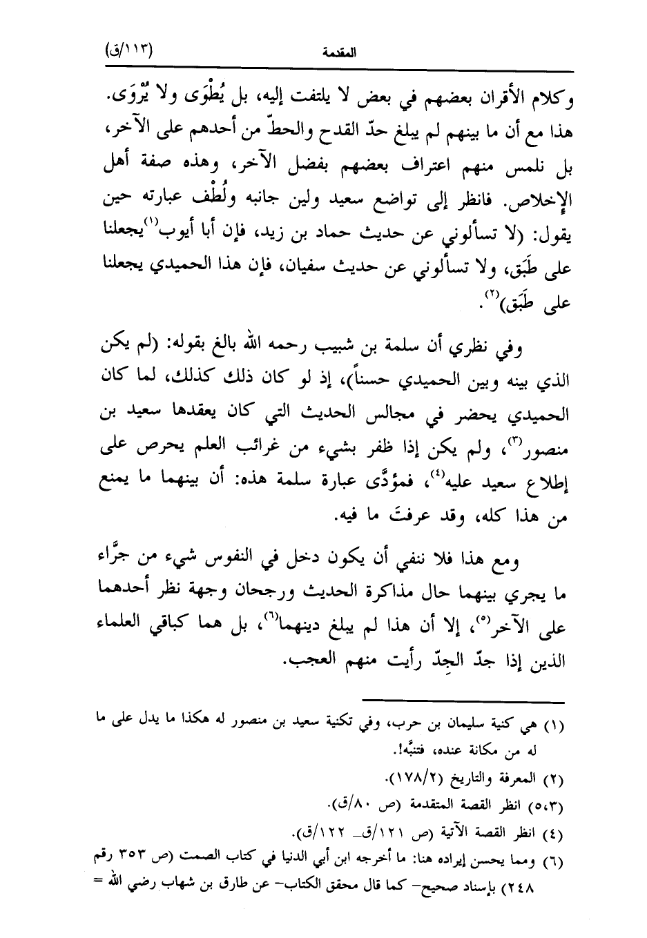 هذا مع أن ما بينهم لم يبلغ حدّ القدح والحطّ من أحدهم على الآخر، بل نلمس منهم اعتراف بعضهم بفضل الآخر، وهذه صفة أهل الإخلاص. فانظر إلى تواضع سعيد ولين جانبه ولُطْف عبارته حين يقول: (لا تسألوني عن حديث حماد بن زيد، فإن أبا أيوب (¬١) يجعلنا على طَبَق، ولا تسألوني عن حديث سفيان، فإن هذا الحميدي يجعلنا على طَبَق) (¬٢).