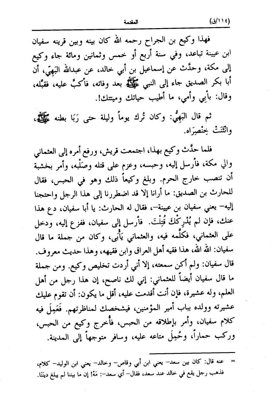 فلما حدَّث وكيع بهذا، اجتمعت قريش، ورفع أمره إلى العثماني والي مكة، فأرسل إليه، وحبسه، وعزم على قتله وصَلْبه، وأمر بخشبة أن تنصب خارج الحرم. وبلغ وكيعاً ذلك وهو في الحبس، فقال للحارث بن الصديق: ما أرانا إلا قد اضطررنا إلى هذا الرجل واحتجنا إليه- يعني سفيان بن عيينة-، فقال له الحارث: يا أبا سفيان، دع هذا عنك، فإن لم يُدْرِكْكَ قُتِلْتَ. فأرسل إلى سفيان، ففزع إليه، ودخل على العثماني، فكلَّمه فيه، والعثماني يَأْبَى، وكان من جملة ما قال سفيان: الله الله، هذا فقيه أهل العراق وابن فقيهه، وهذا حديث معروف.
