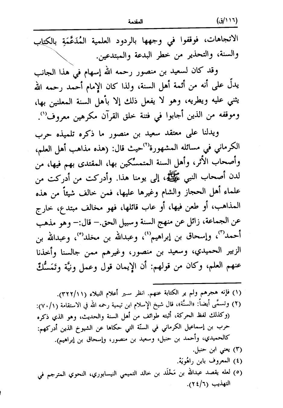 وقد كان لسعيد بن منصور رحمه الله إسهام في هذا الجانب يدلّ على أنه من أئمة أهل السنة، ولذا كان الإمام أحمد رحمه الله يثني عليه ويطريه، وهو لا يفعل ذلك إلا بأهل السنة المعلنين بها، وموقفه من الذين أجابوا في فتنة خلق القرآن مكرهين معروف (¬١).