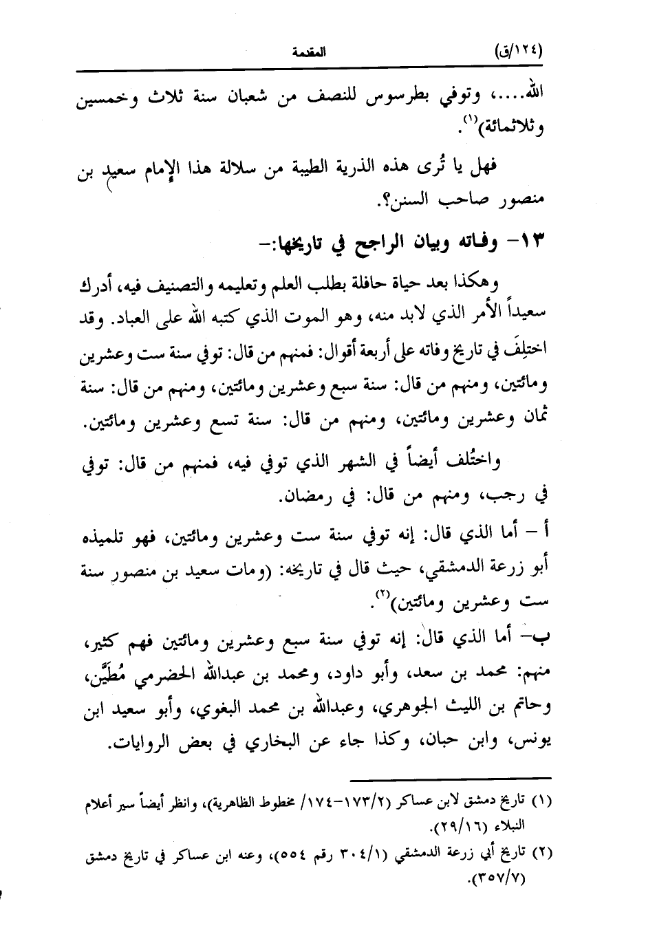 أ- أما الذي قال: إنه توفي سنة ست وعشرين ومائتين، فهو تلميذه أبو زرعة الدمشقي، حيث قال في تاريخه: (ومات سعيد بن منصور سنة ست وعشرين ومائتين) (¬٢).