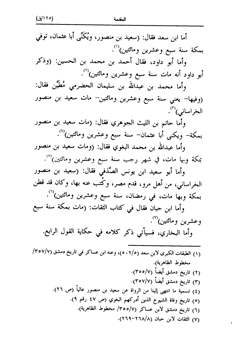وأما حاتم بن الليث الجوهري فقال: (مات سعيد بن منصور بمكة- ويكنى أبا عثمان- سنة سبع وعشرين ومائتين) (¬٤).