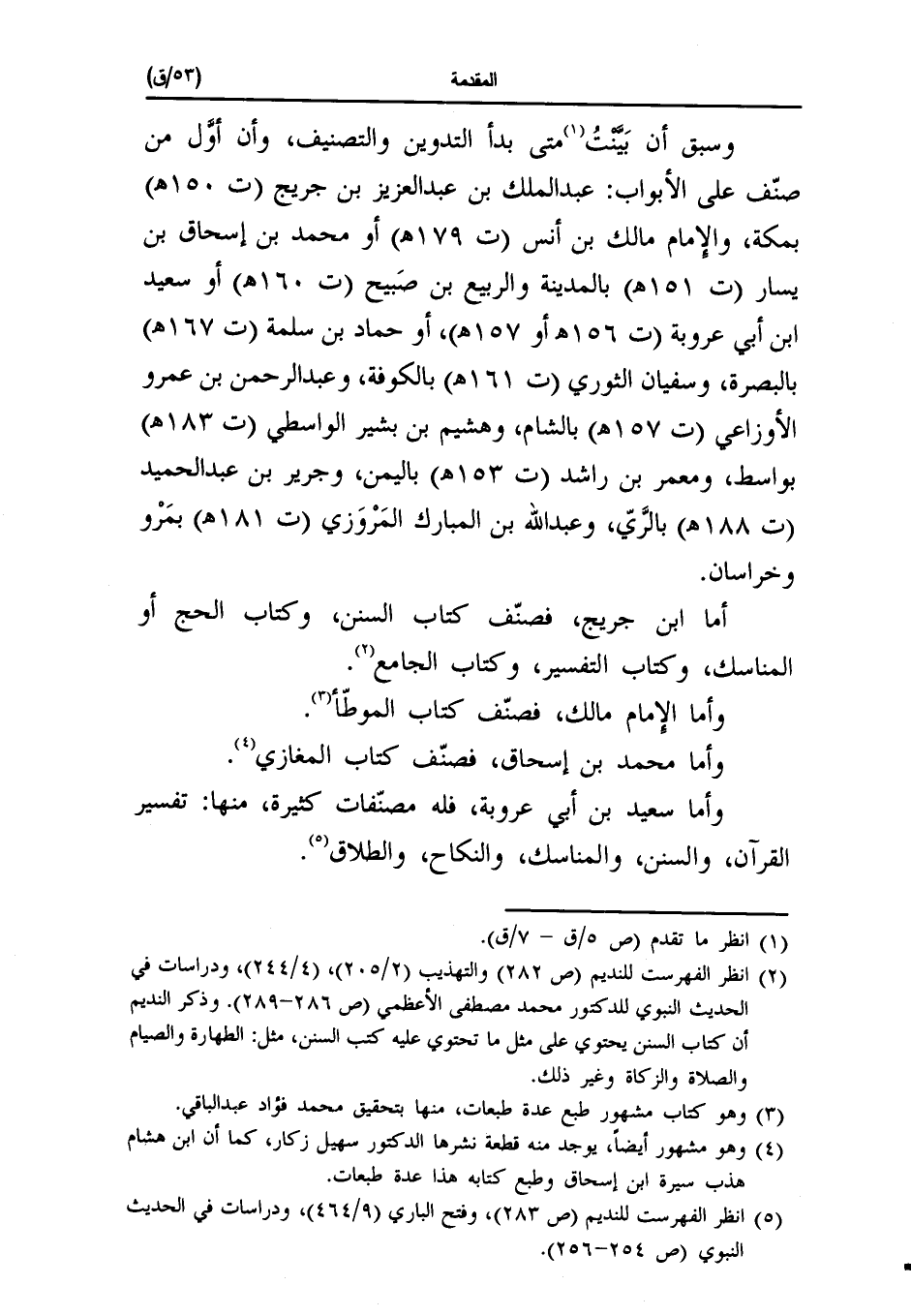 وسبق أن بَيَّنْتُ (¬١) متى بدأ التدوين والتصنيف، وأن أوَّل من صنّف على الأبواب: عبد الملك بن عبد العزيز بن جريج (ت ١٥٠ هـ) بمكة، والإمام مالك بن أنس (ت ١٧٩ هـ) أو محمد بن إسحاق بن يسار (ت ١٥١ هـ) بالمدينة والربيع بن صَبيح (ت ١٦٠ هـ) أو سعيد بن أبي عروبة (ت ١٥٦ هـ أو ١٥٧ هـ)، أو حماد بن سلمة (ت ١٦٧ هـ) بالبصرة، وسفيان الثوري (ت ١٦١ هـ) بالكوفة، وعبد الرحمن بن عمرو الأوزاعي (ت ١٥٧ هـ) بالشام، وهشيم بن بشير الواسطي (ت ١٨٣ هـ) بواسط، ومعمر بن راشد (ت ١٥٣ هـ) باليمن، وجرير بن عبد الحميد (ت ١٨٨ هـ) بالرَّيّ، وعبد الله بن المبارك المَرْوَزي (ت ١٨١ هـ) بمَرْو وخراسان.