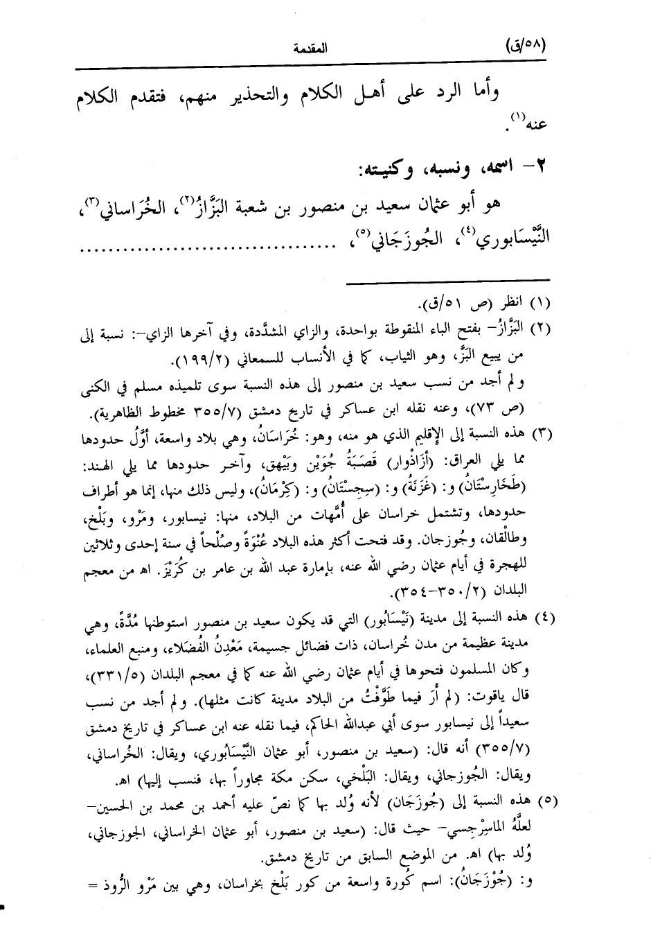 (¬٥) هذه النسبة إلى (جُوزَجَان) لأنه وُلد بها كما نصّ عليه أحمد بن محمد بن الحسين- لعلَّهُ الماسِرْجِسي- حيث قال: (سعيد بن منصور، أبو عثمان الخراساني، الجوزجاني، وُلد بها) اهـ. من الموضع السابق من تاريخ دمشق.