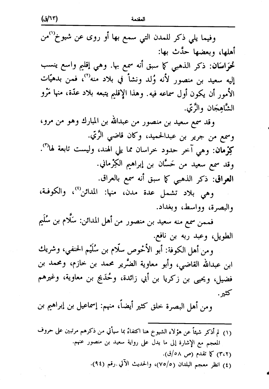 خُرَاسَان: ذكر الذهبي كما سبق أنه سمع بها. وهي إقليم واسع ينسب إليه سعيد بن منصور لأنه وُلد ونشأ في بلاد منه (¬٢)، فمن بدهيّات الأمور أن يكون أول سماعه فيه. وهذا الإقليم يتبعه بلاد عدّة. منها مَرْو الشَّاهِجَان والرَّيّ.