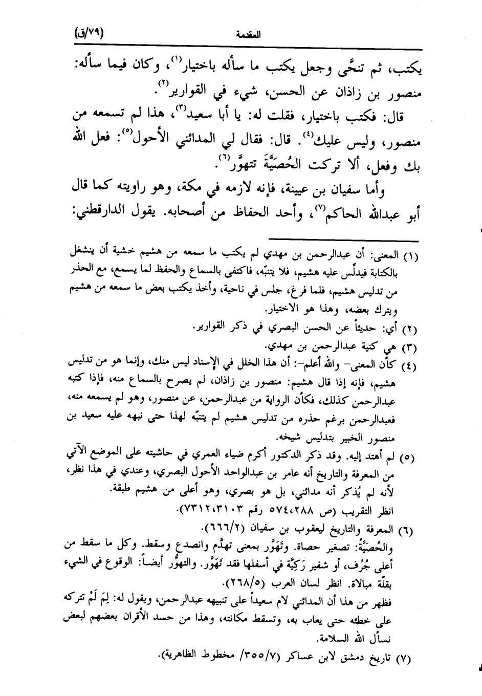 (¬١) المعنى: أن عبد الرحمن بن مهدي لم يكتب ما سمعه من هشيم خشية أن ينشغل بالكتابة فيدلِّس عليه هشيم، فلا يتنبّه، فاكتفى بالسماع والحفظ لما يسمع، مع الحذر من تدليس هشيم، فلما فرغ، جلس في ناحية، وأخذ يكتب بعض ما سمعه من هشيم ويترك بعضه، وهذا هو الاختيار.