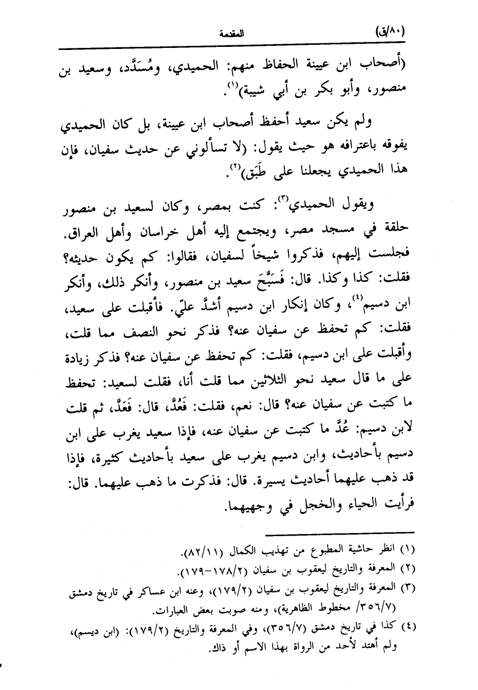 ويقول الحميدي (¬٣): كنت بمصر، وكان لسعيد بن منصور حلقة في مسجد مصر، ويجتمع إليه أهل خراسان وأهل العراق. فجلست إليهم، فذكروا شيخاً لسفيان، فقالوا: كم يكون حديثه؟ فقلت: كذا وكذا. قال: فَسَبَّحَ سعيد بن منصور، وأنكر ذلك، وأنكر ابن دسيم (¬٤)، وكان إنكار ابن دسيم أشدَّ عليّ. فأقبلت على سعيد، فقلت: كم تحفظ عن سفيان عنه؟ فذكر نحو النصف مما قلت، وأقبلت على ابن دسيم، فقلت: كم تحفظ عن سفيان عنه؟ فذكر زيادة على ما قال سعيد نحو الثلاثين مما قلت أنا، فقلت لسعيد: تحفظ ما كتبت عن سفيان عنه؟ قال: نعم، فقلت: فَعُدَّ، قال: فَعَدَّ، ثم قلت لابن دسيم: عُدَّ ما كتبت عن سفيان عنه، فإذا سعيد يغرب على ابن دسيم بأحاديث، وابن دسيم يغرب على سعيد بأحاديث كثيرة، فإذا قد ذهب عليهما أحاديث يسيرة. قال: فذكرت ما ذهب عليهما. قال: فرأيت الحياء والخجل في وجهيهما.