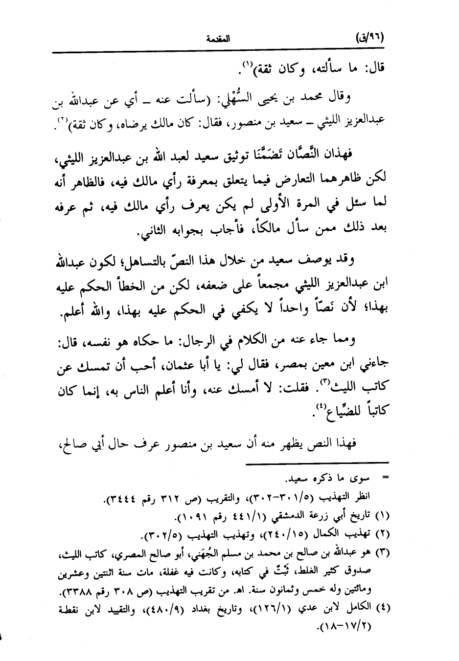 وقال محمد بن يحيى السُّهْلي: (سألت عنه- أي عَنْ عَبْدِ اللَّهِ بْنِ عَبْدِ العزيز الليثي- سعيد بن منصور، فقال: كان مالك يرضاه، وكان ثقة) (¬٢).