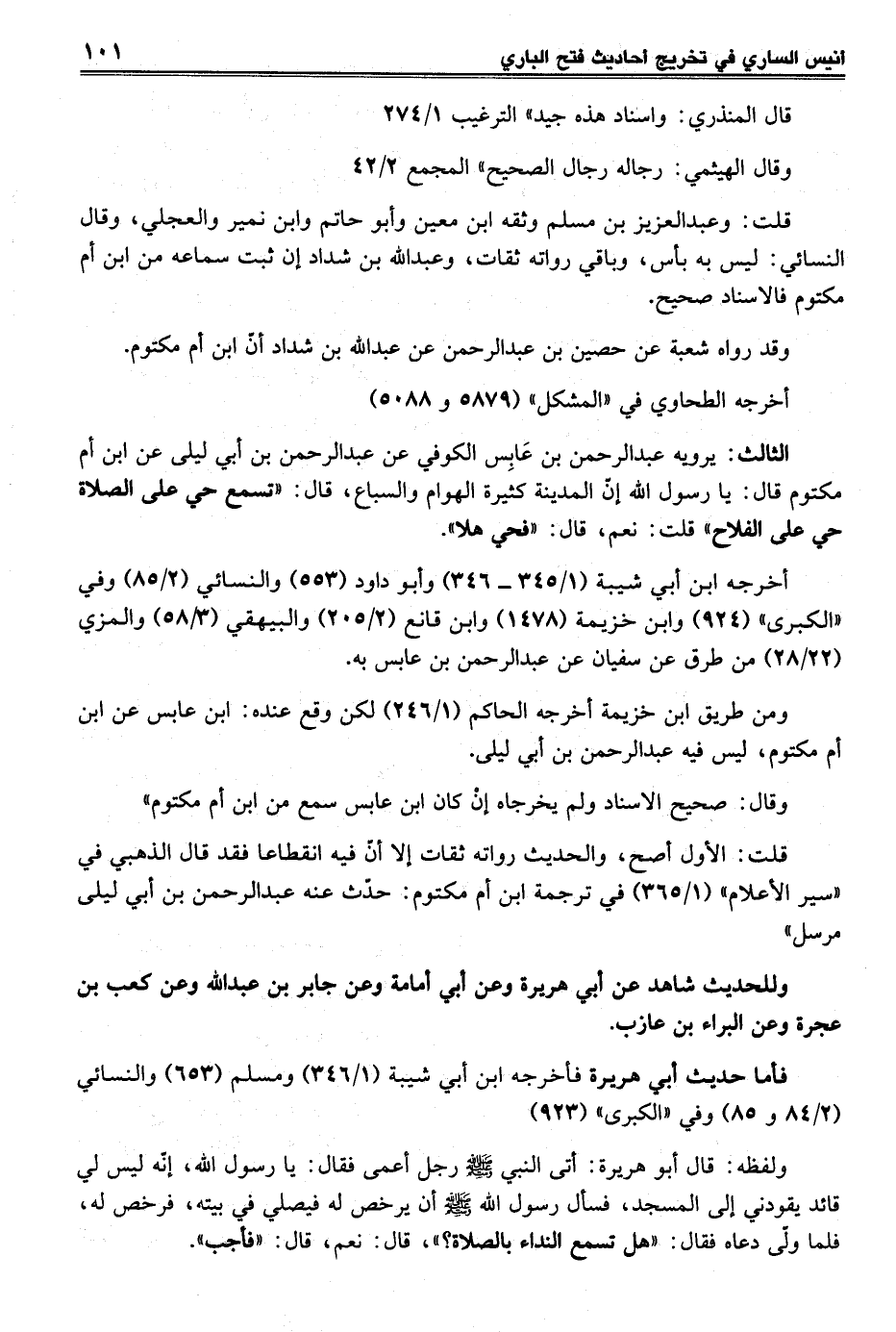 الثالث: يرويه عبد الرحمن بن عَابِس الكوفي عن عبد الرحمن بن أبي ليلى عن ابن أم مكتوم قال: يا رسول الله إن المدينة كثيرة الهوام والسباع، قال: "تسمع حي على الصلاة حي على الفلاح" قلت: نعم، قال: "فحي هلا".