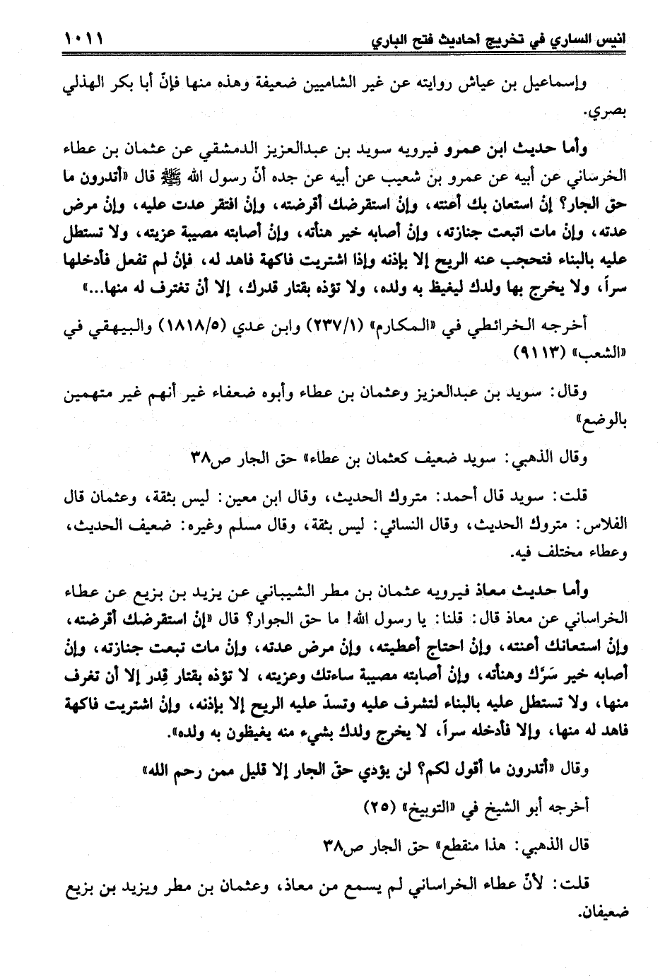 وأما حديث ابن عمرو فيرويه سويد بن عبد العزيز الدمشقي عن عثمان بن عطاء الخرساني عن أبيه عن عمرو بن شعيب عن أبيه عن جده أن رسول الله - صلى الله عليه وسلم - قال "أتدرون ما حق الجار؟ إنْ استعان بك أعنته، وإنْ استقرضك أقرضته، وإنْ افتقر عدت عليه، وإنْ مرض عدته، وإنّ مات اتبعت جنازته، وإنْ أصابه خير هنأته، وإنْ أصابته مصيبة عزيته، ولا تستطل عليه بالبناء فتحجب عنه الريح إلا بإذنه وإذا اشتريت فاكهة فاهد له، فإنْ لم تفعل فأدخلها سراً، ولا يخرج بها ولدك ليغيظ به ولده، ولا تؤذه بقتار قدرك، إلا أنْ تغترف له منها ... "
