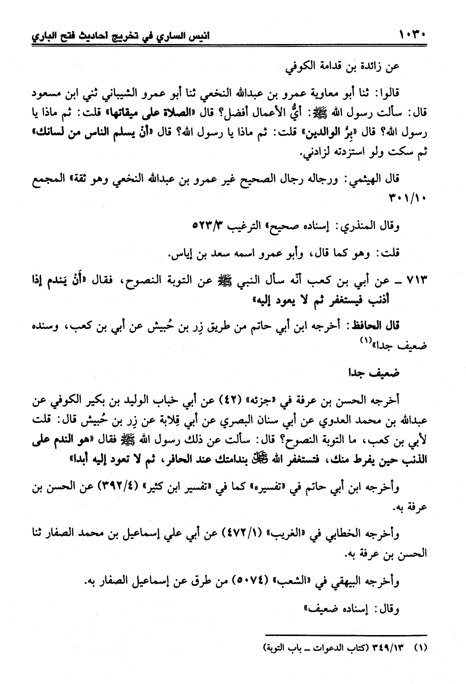 713 - عن أبي بن كعب أنّه سأل النبي - صلى الله عليه وسلم - عن التوبة النصوح، فقال "أَنْ يَندم إذا أذنب فيستغفر ثم لا يعود إليه"
