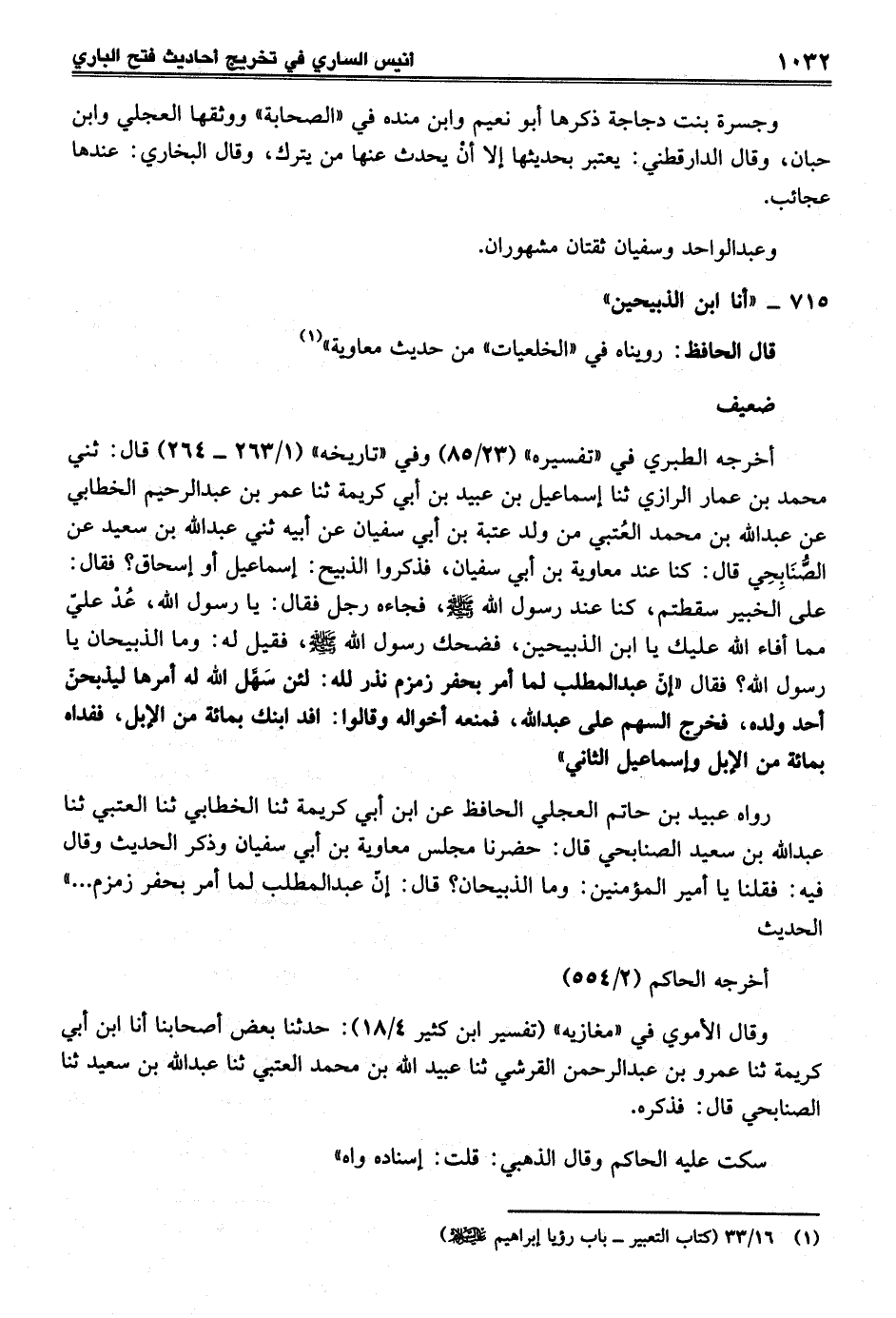 أخرجه الطبري في "تفسيره" (23/ 85) وفي "تاريخه" (1/ 263 - 264) قال: ثني محمَّد بن عمار الرازي ثنا إسماعيل بن عبيد بن أبي كريمة ثنا عمر بن عبد الرحيم الخطابي عن عبد الله بن محمَّد العُتبي من ولد عتبة بن أبي سفيان عن أبيه ثني عبد الله بن سعيد عن الصُّنَابِحِي قال: كنا عند معاوية بن أبي سفيان، فذكروا الذبيح: إسماعيل أو إسحاق؟ فقال: على الخبير سقطتم، كنا عند رسول الله - صلى الله عليه وسلم -، فجاءه رجل فقال: يا رسول الله، عُدْ عليّ مما أفاء الله عليك يا ابن الذبيحين، فضحك رسول الله - صلى الله عليه وسلم -، فقيل له: وما الذبيحان يا رسول الله؟ فقال "إنّ عبد المطلب لما أمر بحفر زمزم نذر لله: لئن سَهَّل الله له أمرها ليذبحنّ أحد ولده، فخرج السهم على عبد الله، فمنعه أخواله وقالوا: افد ابنك بمائة من الإبل، ففداه بمائة من الإبل وإسماعيل الثاني"