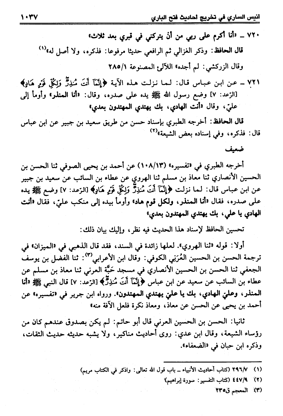 721 - عن ابن عباس قال: لما نزلت هذه الآية {إِنَّمَا أَنْتَ مُنْذِرٌ وَلِكُلِّ قَوْمٍ هَادٍ} [الرعد: 7] وضع رسول الله - صلى الله عليه وسلم - يده على صدره، وقال: "أنا المنذر" وأومأ إلى عليّ، وقال "أنت الهادي، بك يهتدي المهتدون بعدي"