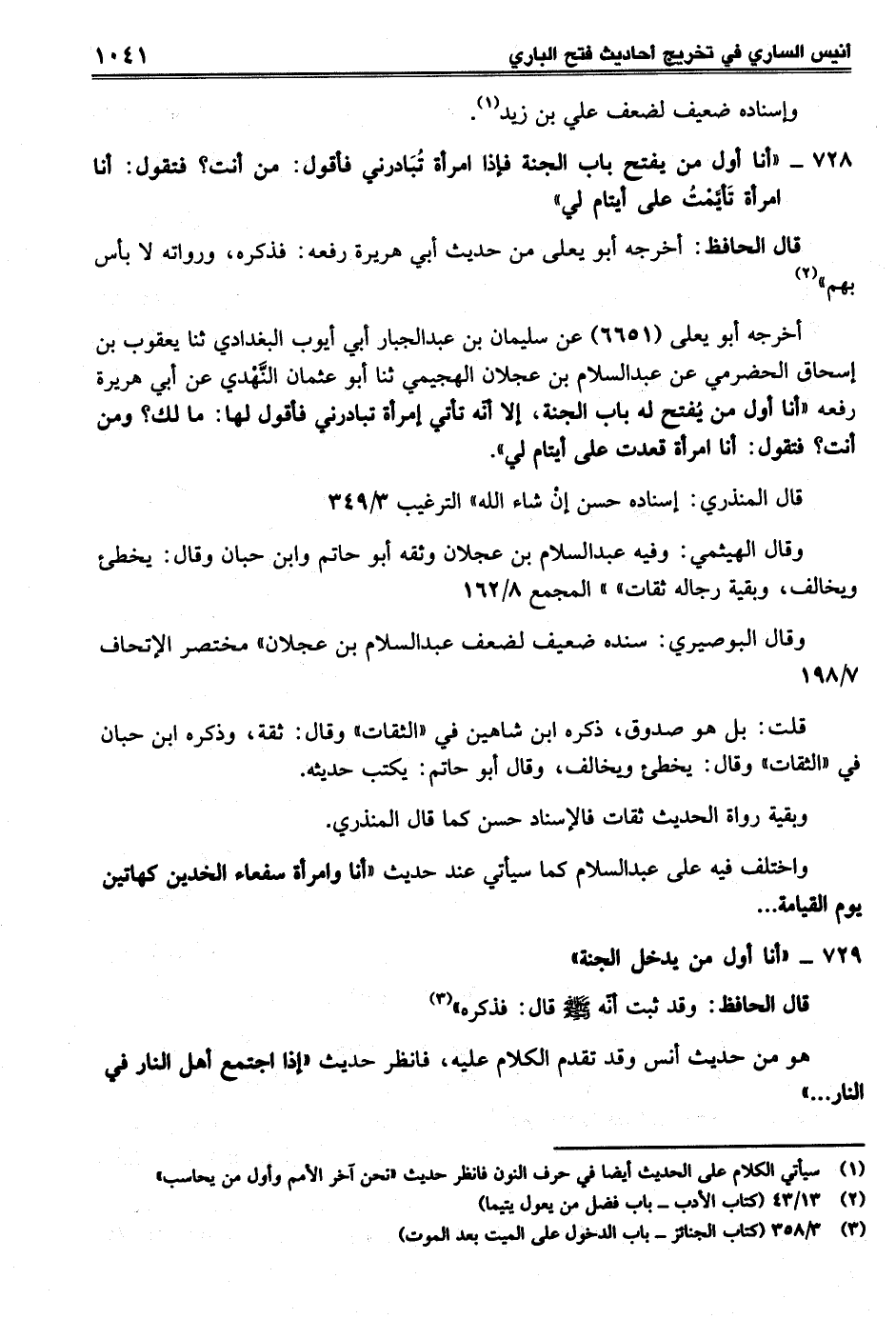 أخرجه أبو يعلى (6651) عن سليمان بن عبد الجبار أبي أيوب البغدادي ثنا يعقوب بن إسحاق الحضرمي عن عبد السلام بن عجلان الهجيمي ثنا أبو عثمان النَّهدي عن أبي هريرة رفعه "أنا أول من يُفتح له باب الجنة، إلا أنه تأتي إمرأة تبادرني فأقول لها: ما لك؟ ومن أنت؟ فتقول: أنا امرأة قعدت على أيتام لي".