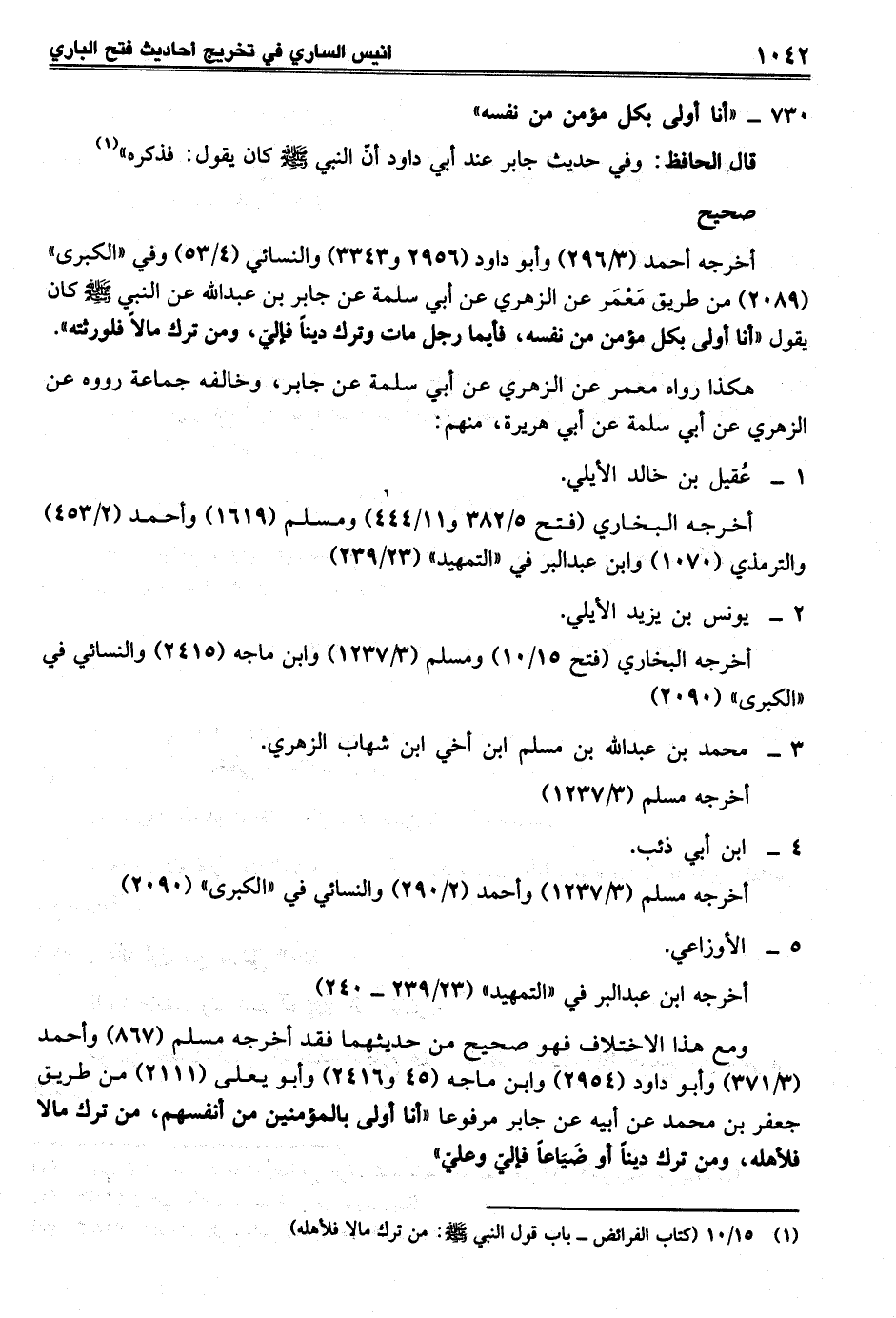 أخرجه أحمد (3/ 296) وأبو داود (2956 و 3343) والنسائي (4/ 53) وفي "الكبرى" (2089) من طريق مَعْمَر عن الزهري عن أبي سلمة عن جابر بن عبد الله عن النبي - صلى الله عليه وسلم - كان يقول "أنا أولى بكل مؤمن من نفسه، فأيما رجل مات وترك ديناً فإليّ، ومن ترك مالاً فلورثته".