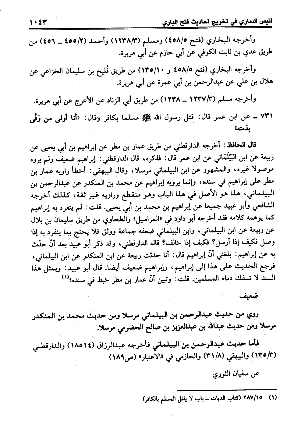 731 - عن ابن عمر قال: قتل رسول الله - صلى الله عليه وسلم - مسلما بكافر وقال: "أنا أولى من وَفَّى بذمته"