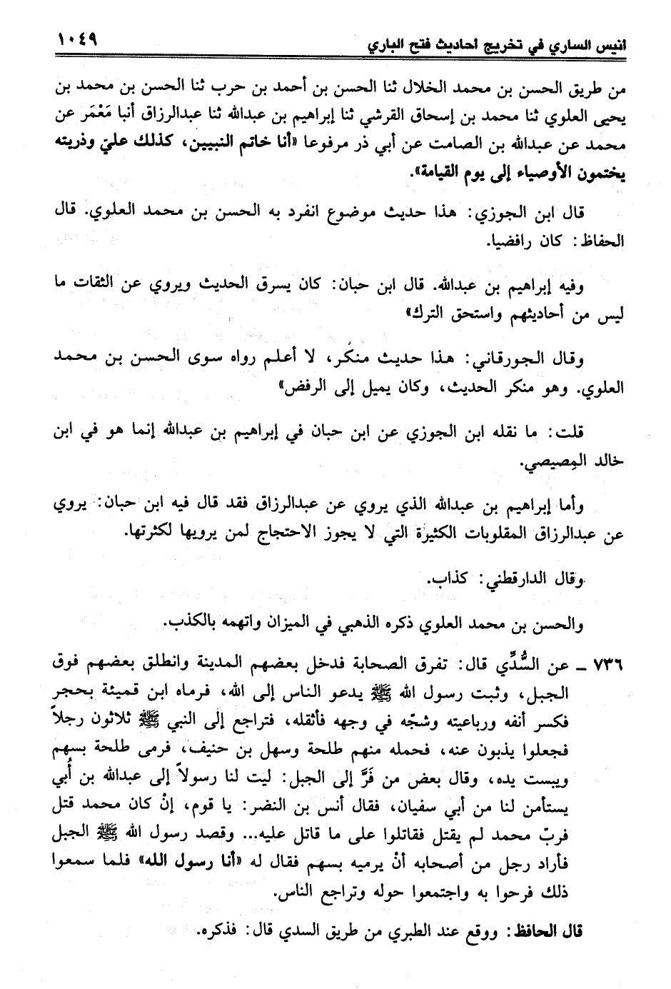 وقال الجورقاني: هذا حديث منكر، لا أعلم رواه سوى الحسن بن محمَّد العلوي. وهو منكر الحديث، وكان يميل إلى الرفض"
