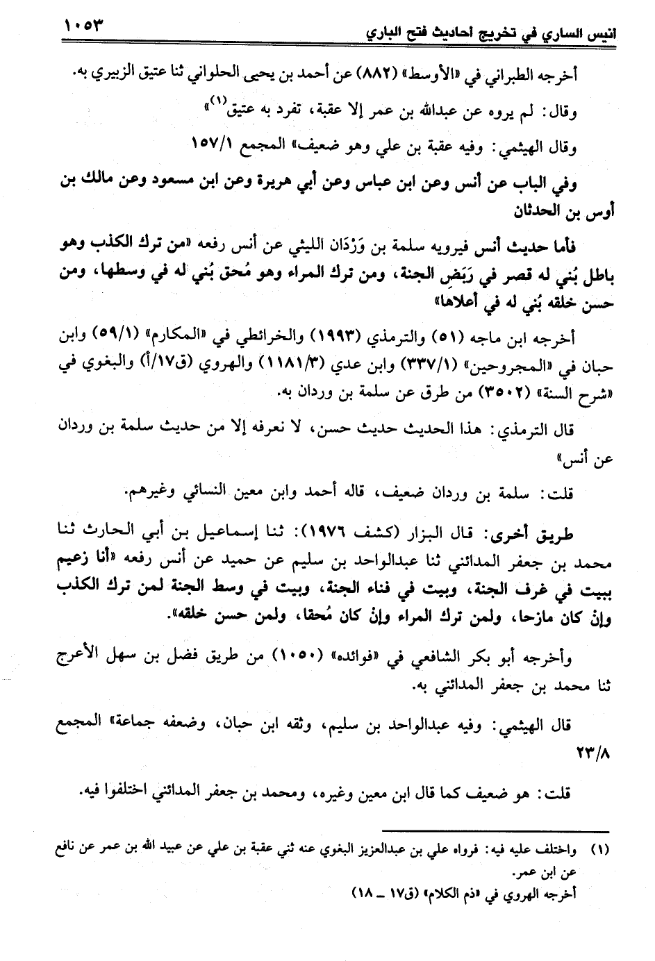 فأما حديث أنس فيرويه سلمة بن وَرْدَان الليثي عن أنس رفعه "من ترك الكذب وهو باطل بُني له قصر في رَبَضِ الجنة، ومن ترك المراء وهو مُحق بُني له في وسطها، ومن حسن خلقه بُني له في أعلاها"