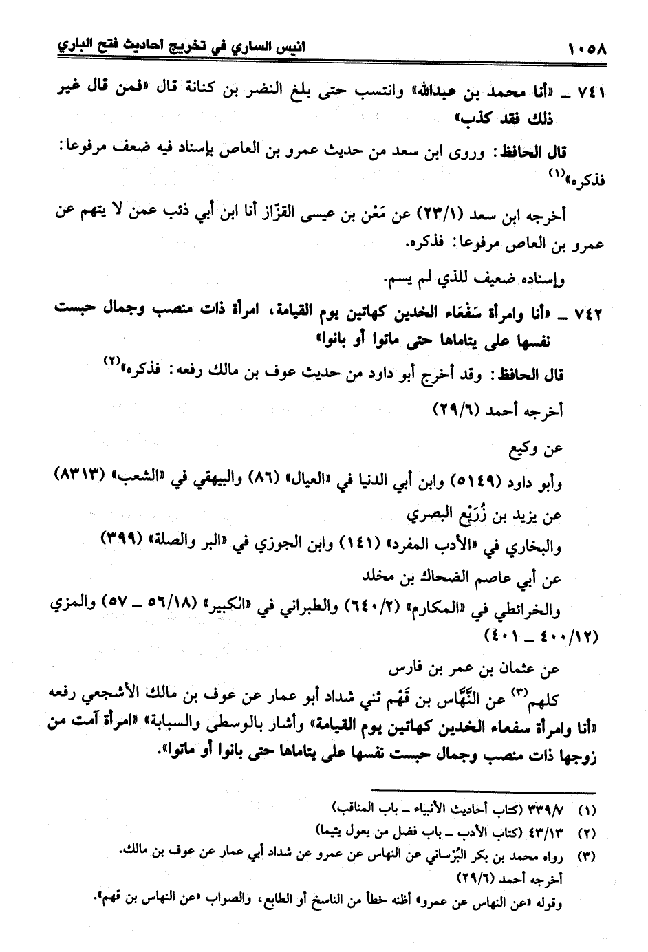 742 - "أنا وامرأة سَفعَاء الخدين كهاتين يوم القيامة، امرأة ذات منصب وجمال حبست نفسها على يتاماها حتى ماتوا أو بانوا"