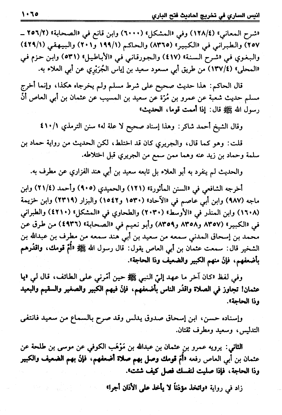 أخرجه الشافعي في "السنن المأثورة" (121) والحميدي (905) وأحمد (4/ 21) وابن ماجه (987) وابن أبي عاصم في "الآحاد" (1530 و 1542) والبزار (2319) وابن خزيمة (1608) وابن المنذر في "الأوسط" (2030) والطحاوي في "المشكل" (4210) والطبراني في "الكبير" (8357 و 8358 و 8359) وأبو نعيم في "الصحابة" (4936) من طرق عن محمَّد بن إسحاق المدني سمعه من سعيد بن أبي هند سمعه من مطرف بن عبد الله بن الشخير قال: سمعت عثمان بن أبي العاص يقول: قال رسول الله - صلى الله عليه وسلم -"أُمَّ قومك، واقدُرهم بأضعفهم، فإن منهم الكبير والضعيف وذا الحاجه".