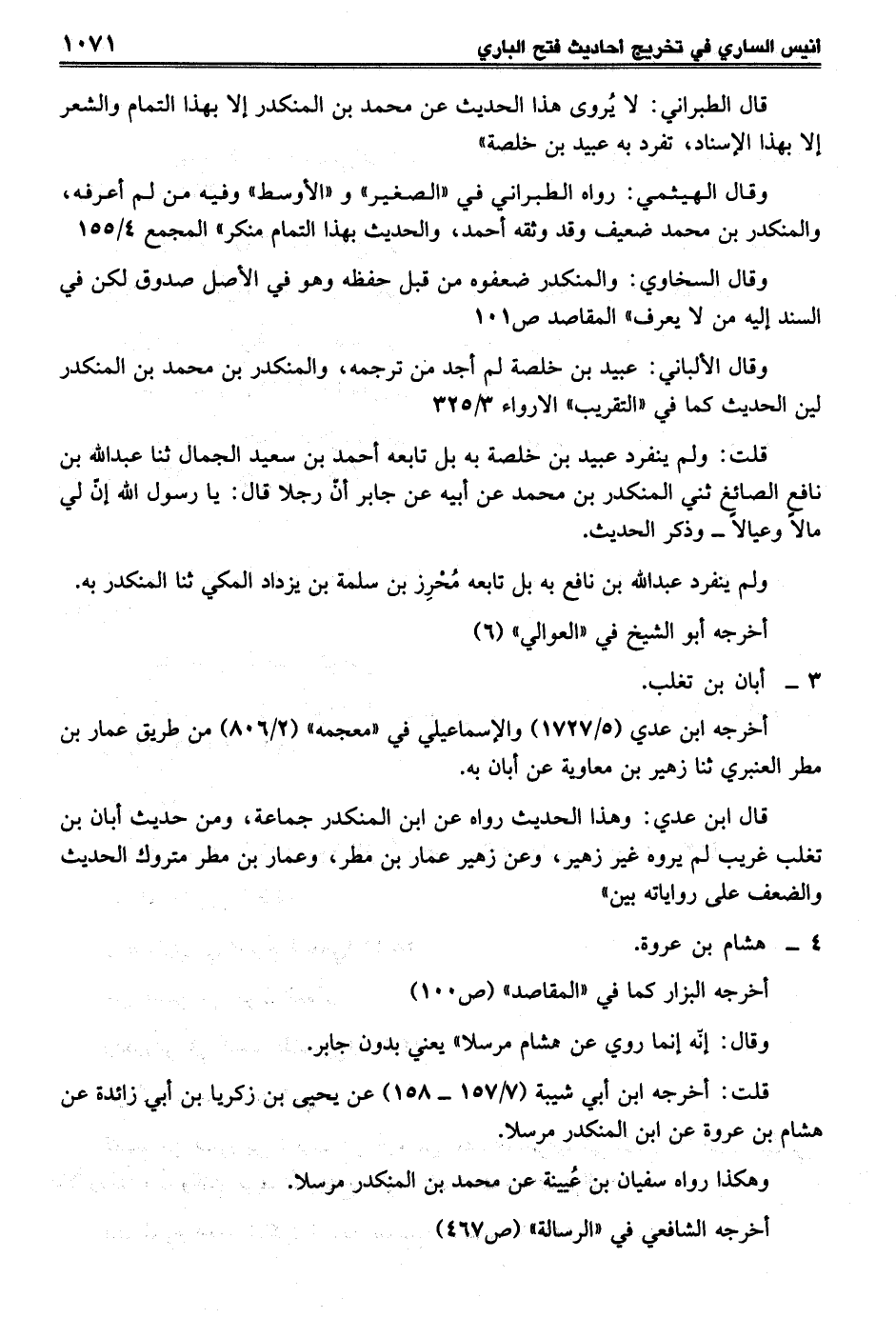 وقال الألباني: عبيد بن خلصة لم أجد من ترجمه، والمنكدر بن محمَّد بن المنكدر لين الحديث كما في "التقريب" الارواء 3/ 325