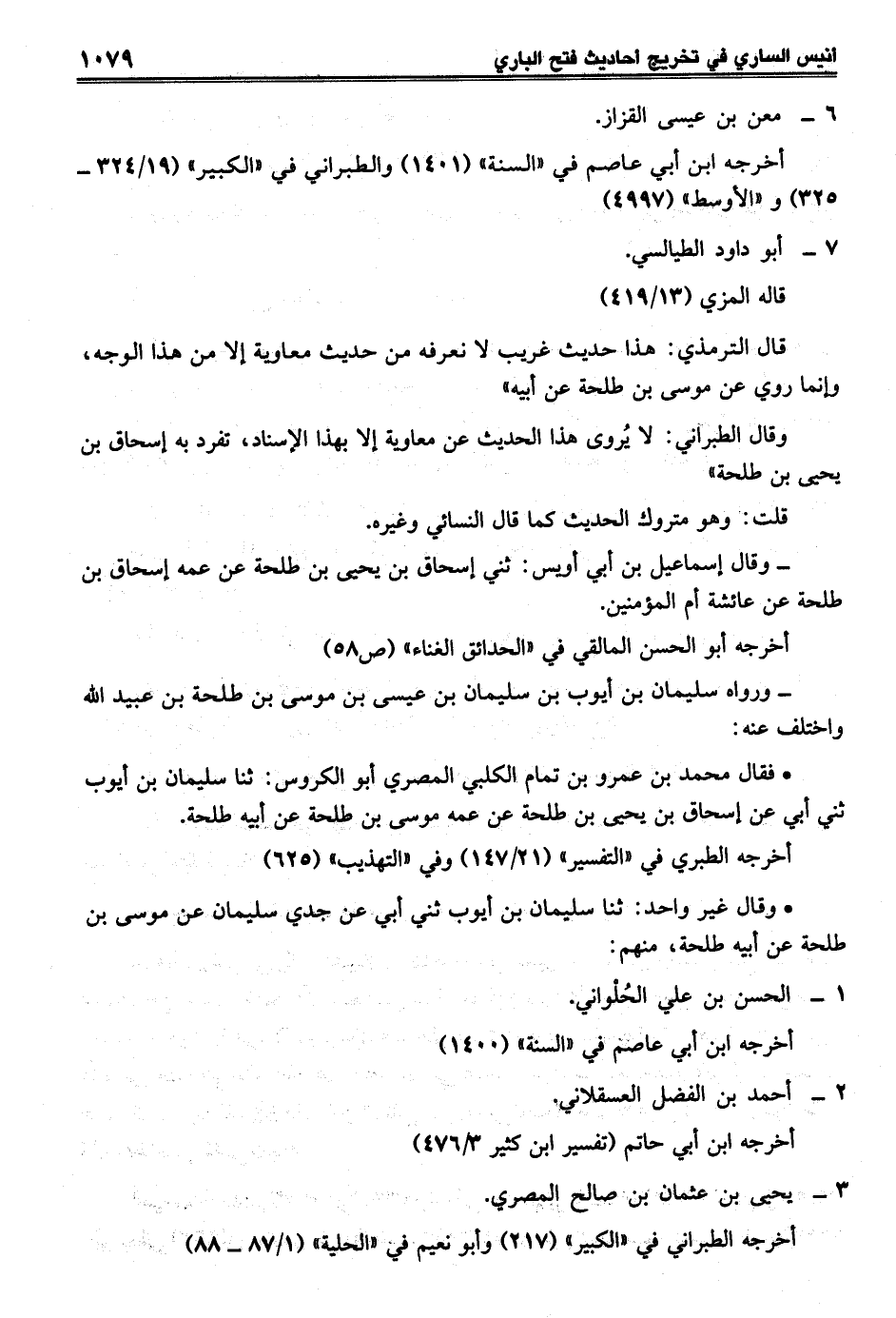 • فقال محمَّد بن عمرو بن تمام الكلبي المصري أبو الكروس: ثنا سليمان بن أيوب ثني أبي عن إسحاق بن يحيى بن طلحة عن عمه موسى بن طلحة عن أبيه طلحة.