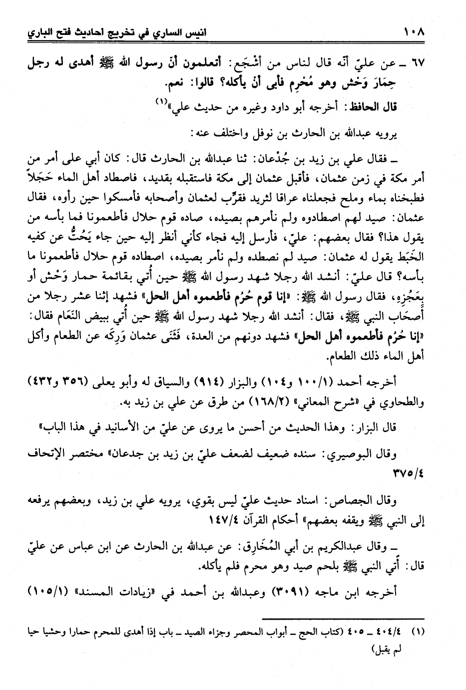 - فقال علي بن زيد بن جُدْعان: ثنا عبد الله بن الحارث قال: كان أبي على أمر من أمر مكة في زمن عثمان، فأقبل عثمان إلى مكة فاستقبله بقديد، فاصطاد أهل الماء حَجَلاً فطبخناه بماء وملح فجعلناه عراقا لثريد فقرِّب لعثمان وأصحابه فأمسكوا حين رأوه، فقال عثمان: صيد لهم اصطادوه ولم نأمرهم بصيده، صاده قوم حلال فأطعمونا فما بأسه من يقول هذا؟ فقال بعضهم: عليّ، فأرسل إليه فجاء كأني انظر إليه حين جاء يَحُتُّ عن كفيه الخَبَط يقول له عثمان: صيد لم نصطده ولم نأمر بصيده، اصطاده قوم حلال فأطعمونا ما بأسه؟ قال عليّ: أنشد الله رجلا شهد رسول الله - صلى الله عليه وسلم - حين أُتي بقائمة حمار وَحْش أو بِعَجُزِهِ، فقال رسول الله - صلى الله عليه وسلم -: "إنا قوم حُرُم فأطعموه أهل الحل" فشهد إثنا عشر رجلا من أَصحَاب النبي - صلى الله عليه وسلم -، فقال: أنشد الله رجلا شهد رسول الله - صلى الله عليه وسلم - حين أُتي ببيض النَعَام فقال: "إنا حُرُم فأطعموه أهل الحل" فشهد دونهم من العدة، فَثَنَى عثمان وَرِكَه عن الطعام وأكل أهل الماء ذلك الطعام.