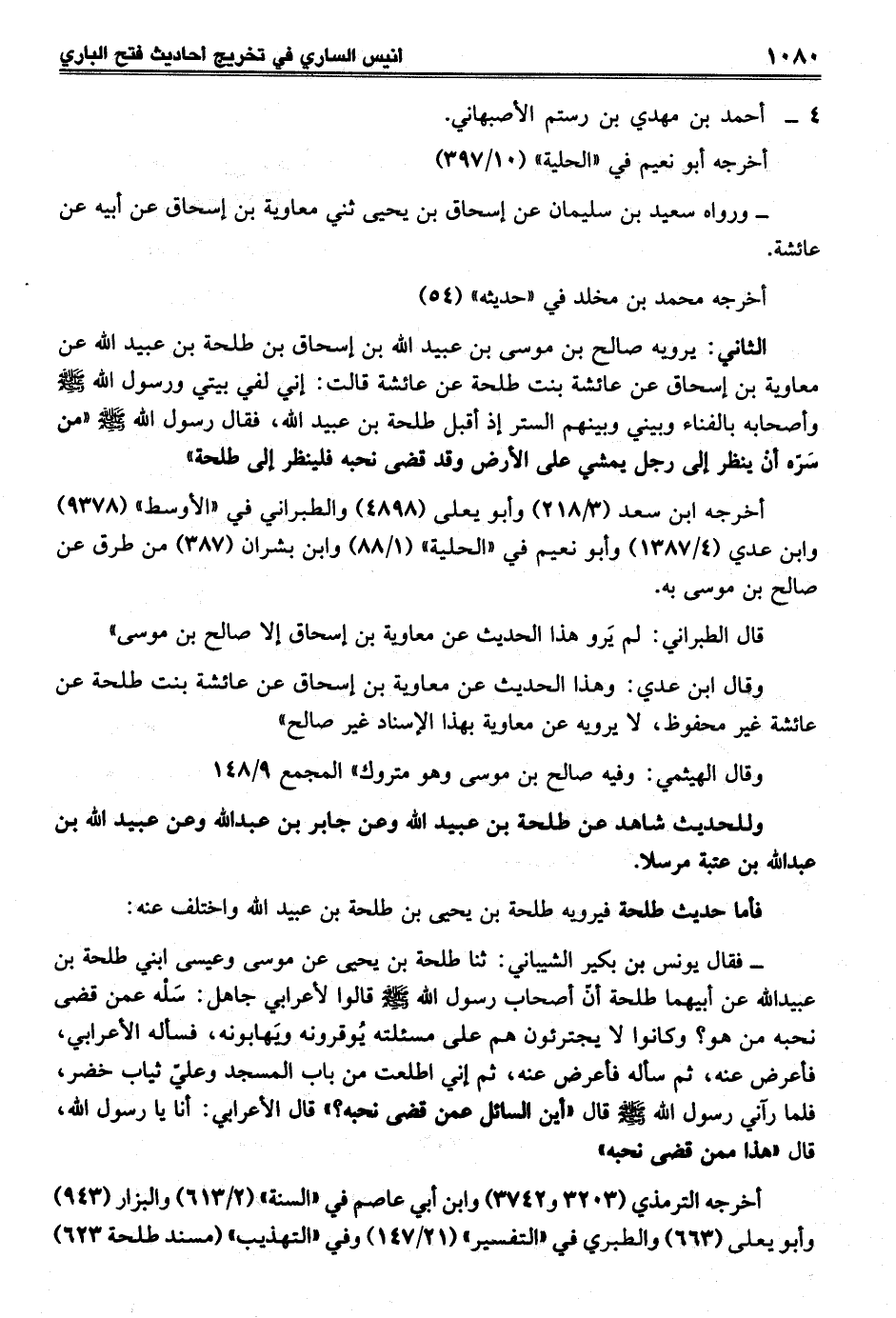 - فقال يونس بن بكير الشيباني: ثنا طلحة بن يحيى عن موسى وعيسى ابني طلحة بن عبيد الله عن أبيهما طلحة أنّ أصحاب رسول الله - صلى الله عليه وسلم - قالوا لأعرابي جاهل: سَلْه عمن قضى نحبه من هو؟ وكانوا لا يجترئون هم على مسئلته يُوقرونه وَيهابونه، فسأله الأعرابي، فأعرض عنه، ثم سأله فأعرض عنه، ثم إني اطلعت من باب المسجد وعليّ ثياب خضر، فلما رآني رسول الله - صلى الله عليه وسلم - قال "أين السائل عمن قضى نحبه؟ " قال الأعرابي: أنا يا رسول الله، قال "هذا ممن قضى نحبه"