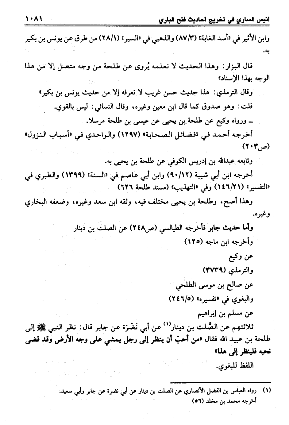 ثلاثتهم عن الصَّلت بن دينار (¬1) عن أبي نَضْرَة عن جابر قال: نظر النبي - صلى الله عليه وسلم - إلى طلحة بن عبيد الله فقال "من أحب أن ينظر إلى رجل يمشي على وجه الأرض وقد قضى نحبه فلينظر إلى هذا"