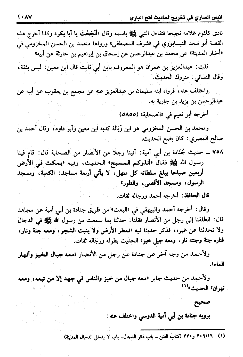 758 - حديث جُنَادة بن أبي أمية: أتينا رجلاً من الأنصار من الصحابة قال: قام فينا رسول الله - صلى الله عليه وسلم - فقال "أنذركم المسيح" الحديث، وفيه "يمكث في الأرض أربعين صباحا يبلغ سلطانه كل منهل، لا يأتي أربعة مساجد: الكعبة، ومسجد الرسول، ومسجد الأقصى، والطور"