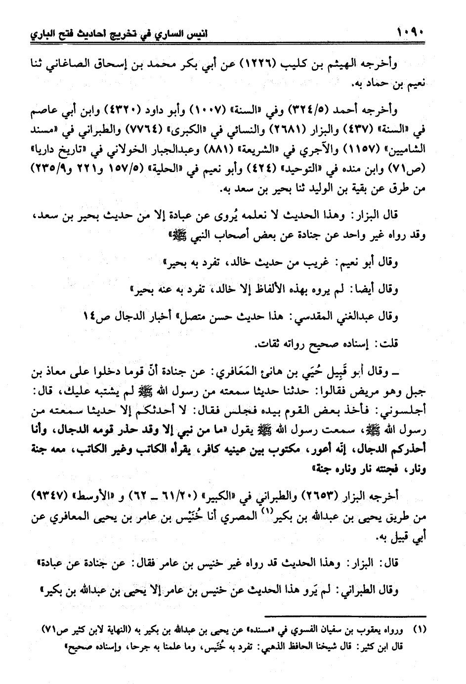 (¬1) ورواه يعقوب بن سفيان الفسوي في "مسنده" عن يحيى بن عبد الله بن بكير به (النهاية لابن كثير ص 71) قال ابن كثير: قال شيخنا الحافظ الذهبي: تفرد به خُنَيس، وما علمنا به جرحاً، وإسناده صحيح"