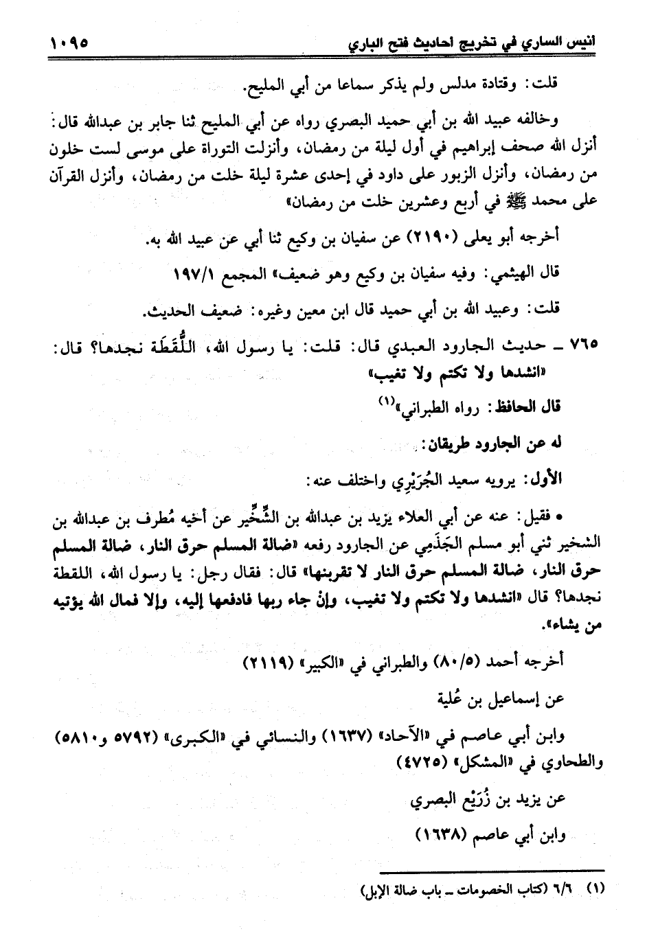 • فقيل: عنه عن أبي العلاء يزيد بن عبد الله بن الشِّخّير عن أخيه مُطَرِّف بن عبد الله بن الشخير ثني أبو مسلم الجَذَمِي عن الجارود رفعه "ضالة المسلم حرق النار، ضالة المسلم حرق النار، ضالة المسلم حرق النار لا تقربنها" قال: فقال رجل: يا رسول الله، اللقطة نجدها؟ قال "انشدها ولا تكتم ولا تغيب، وإنْ جاء ربها فادفعها إليه، وإلا فمال الله يؤتيه من يشاء".