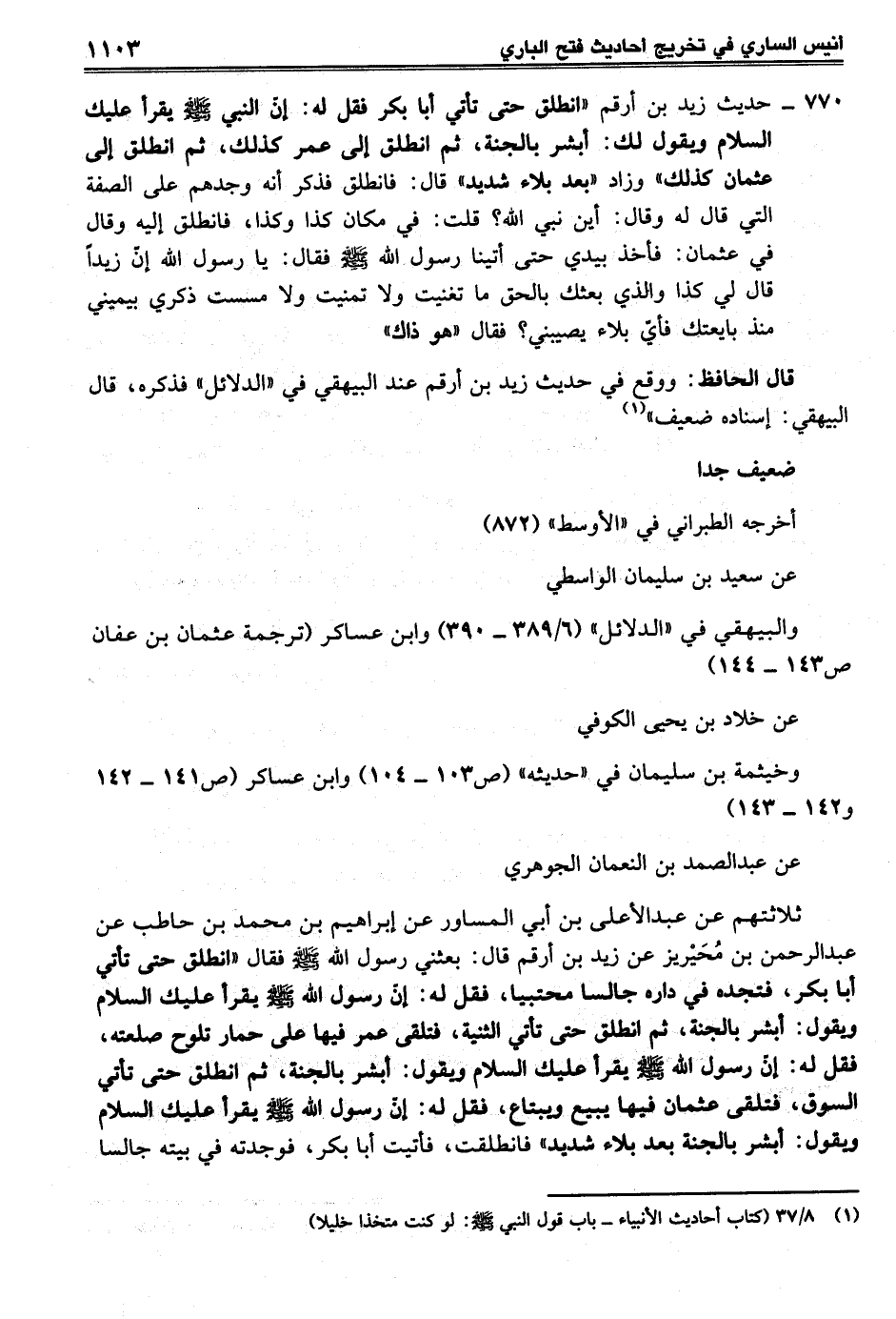 770 - حديث زيد بن أرقم "انطلق حتى تأتي أبا بكر فقل له: إنّ النبي - صلى الله عليه وسلم - يقرأ عليك السلام ويقول لك: أبشر بالجنة، ثم انطلق إلى عمر كذلك، ثم انطلق إلى عثمان كذلك" وزاد "بعد بلاء شديد" قال: فانطلق فذكر أنه وجدهم على الصفة التي قال له وقال: أين نبي الله؟ قلت: في مكان كذا وكذا، فانطلق إليه وقال في عثمان: فأخذ بيدي حتى أتينا رسول الله - صلى الله عليه وسلم - فقال: يا رسول الله إنّ زيداً قال لي كذا والذي بعثك بالحق ما تغنيت ولا تمنيت ولا مسست ذكري بيميني منذ بايعتك فأيّ بلاء يصيبني؟ فقال "هو ذاك"