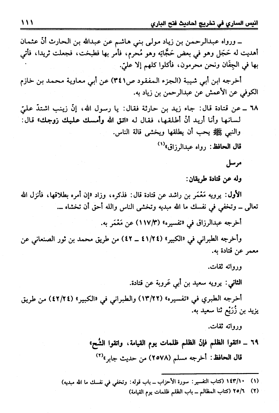 68 - عن قتادة قال: جاء زيد بن حارثة فقال: يا رسول الله، إنّ زينب اشتدّ عليّ لسانها وأنا أريد أن أطلقها، فقال له "اتق الله وأمسك عليك زوجك" قال: والنبي - صلى الله عليه وسلم - يحب أن يطلقها ويخشى قالة الناس.
