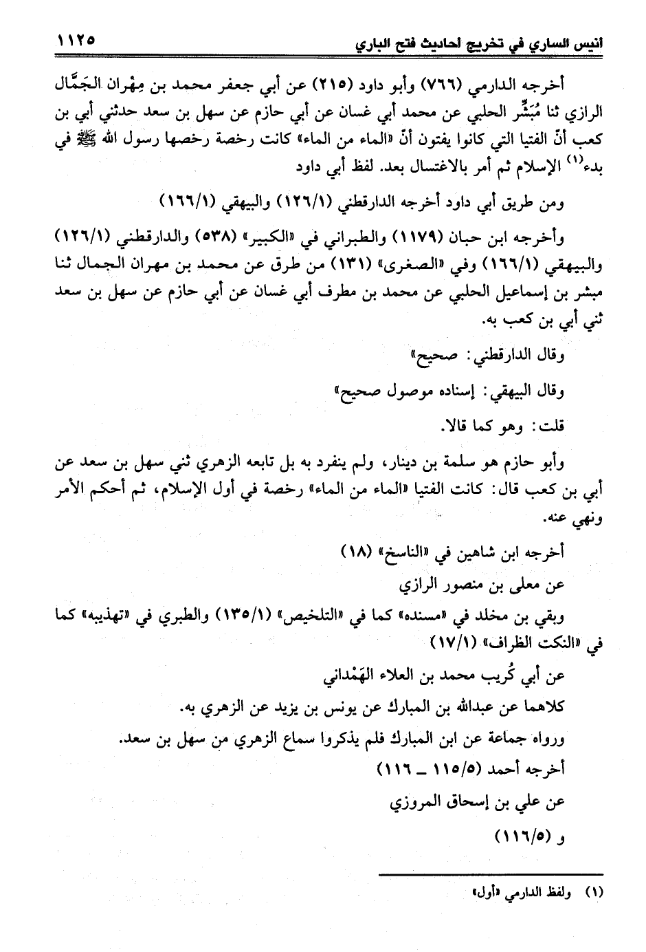 أخرجه الدارمي (766) وأبو داود (215) عن أبي جعفر محمد بن مِهْران الجَمَّال الرازي ثنا مُبَشِّر الحلبي عن محمد أبي غسان عن أبي حازم عن سهل بن سعد حدثني أبي بن كعب أنّ الفتيا التي كانوا يفتون أنّ "الماء من الماء" كانت رخصة رخصها رسول الله - صلى الله عليه وسلم - في بدء (¬1) الإسلام ثم أمر بالاغتسال بعد. لفظ أبي داود