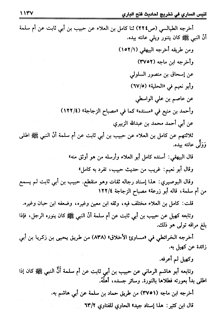 وقال البوصيري: هذا إسناد رجاله ثقات وهو منقطع. حبيب بن أبي ثابت لم يسمع من أم سلمة، قاله أبو زرعة" مصباح الزجاجة 4/ 122