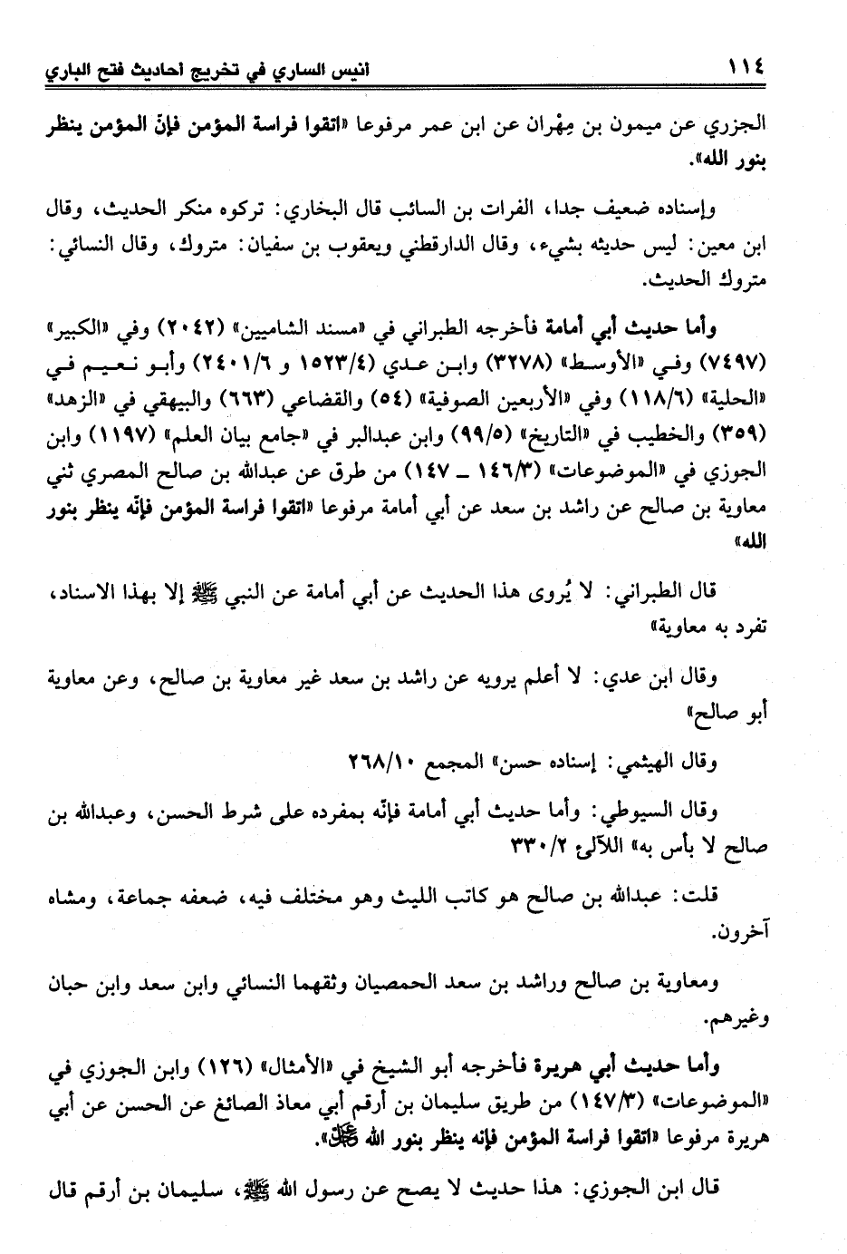 وأما حديث أي أمامة فأخرجه الطبراني في "مسند الشاميين" (2042) وفي "الكبير" (7497) وفي "الأوسط" (3278) وابن عدي (4/ 1523 و 6/ 2401) وأبو نعيم في "الحلية" (6/ 118) وفي "الأربعين الصوفية" (54) والقضاعي (663) والبيهقي في "الزهد" (359) والخطيب في "التاريخ" (5/ 99) وابن عبد البر في "جامع بيان العلم" (1197) وابن الجوزي في "الموضوعات" (3/ 146 - 147) من طرق عن عبد الله بن صالح المصري ثني معاوية بن صالح عن راشد بن سعد عن أبي أمامة مرفوعا "اتقوا فراسة المؤمن فإنّه ينظر بنور الله"