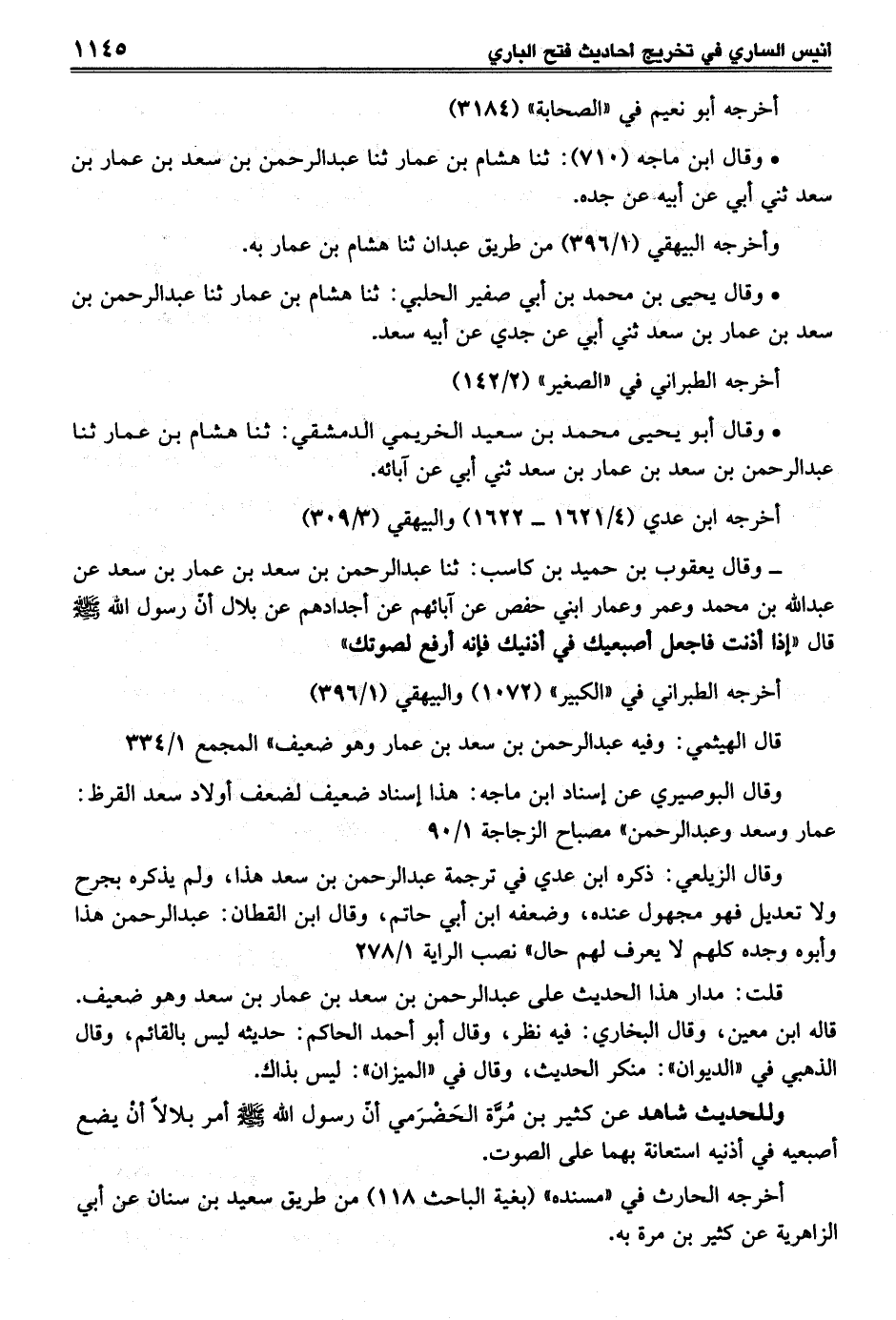 - وقال يعقوب بن حميد بن كاسب: ثنا عبد الرحمن بن سعد بن عمار بن سعد عن عبد الله بن محمد وعمر وعمار ابني حفص عن آبائهم عن أجدادهم عن بلال أنّ رسول الله - صلى الله عليه وسلم - قال "إذا أذنت فاجعل أصبعيك في أذنيك فإنه أرفع لصوتك"