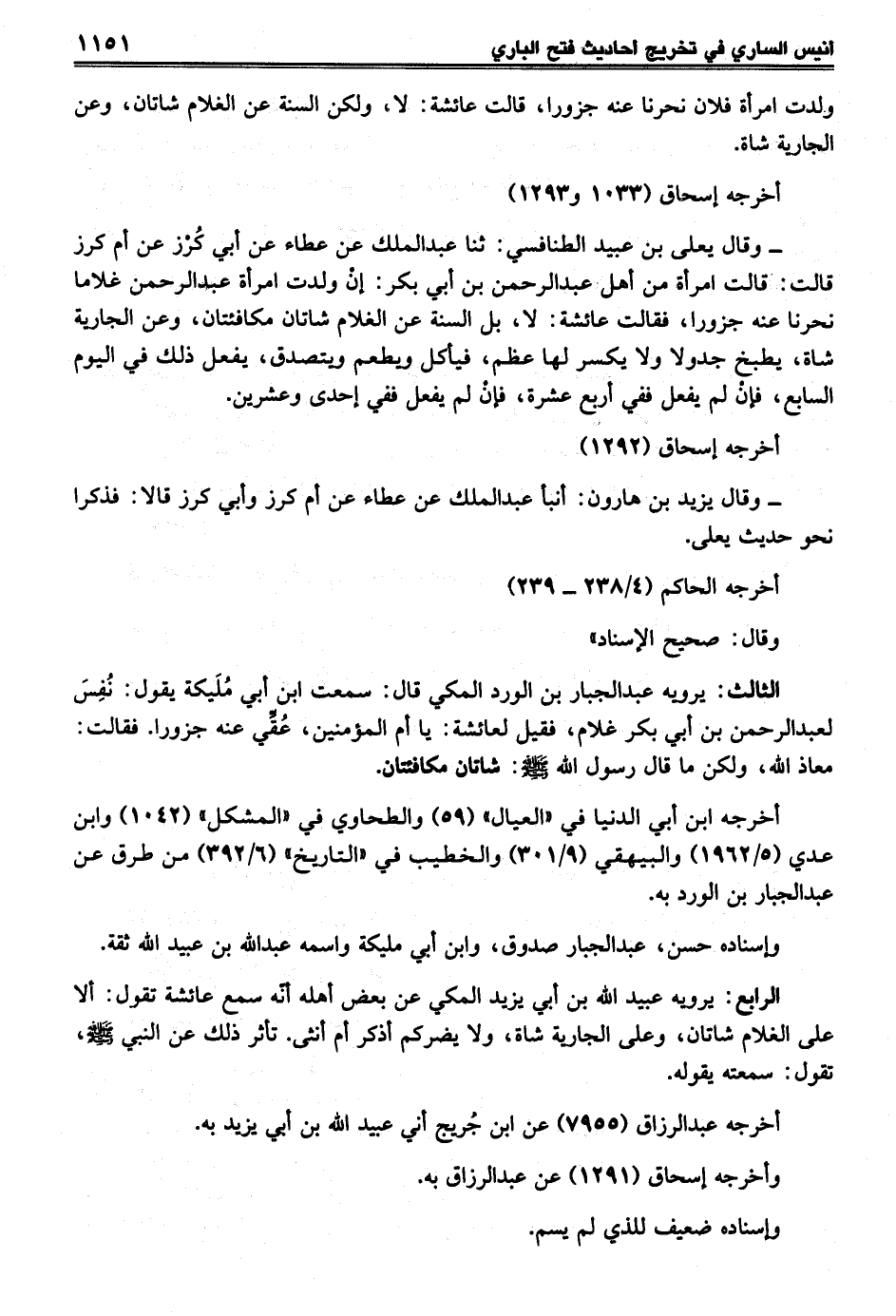 الثالث: يرويه عبد الجبار بن الورد المكي قال: سمعت ابن أبي مُلَيكة يقول: نُفِسَ لعبد الرحمن بن أبي بكر غلام، فقيل لعائشة: يا أم المؤمنين، عُقِّي عنه جزورا. فقالت: معاذ الله، ولكن ما قال رسول الله - صلى الله عليه وسلم -: شاتان مكافئتان.