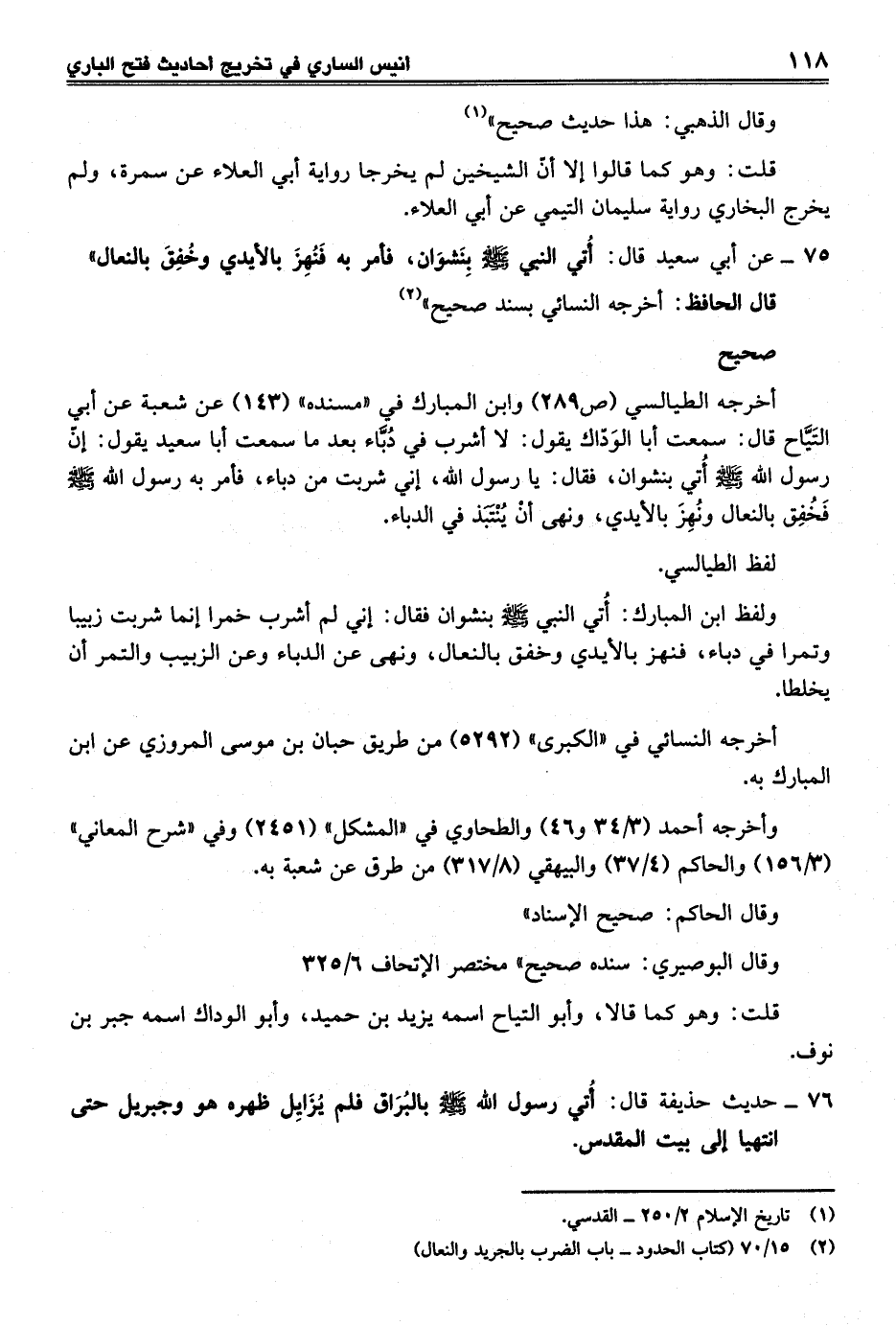 75 - عن أبي سعيد قال: أُتي النبي - صلى الله عليه وسلم - بِنَشوَان، فأمر به فَنُهِزَ بالأيدي وخُفِقَ بالنعال"