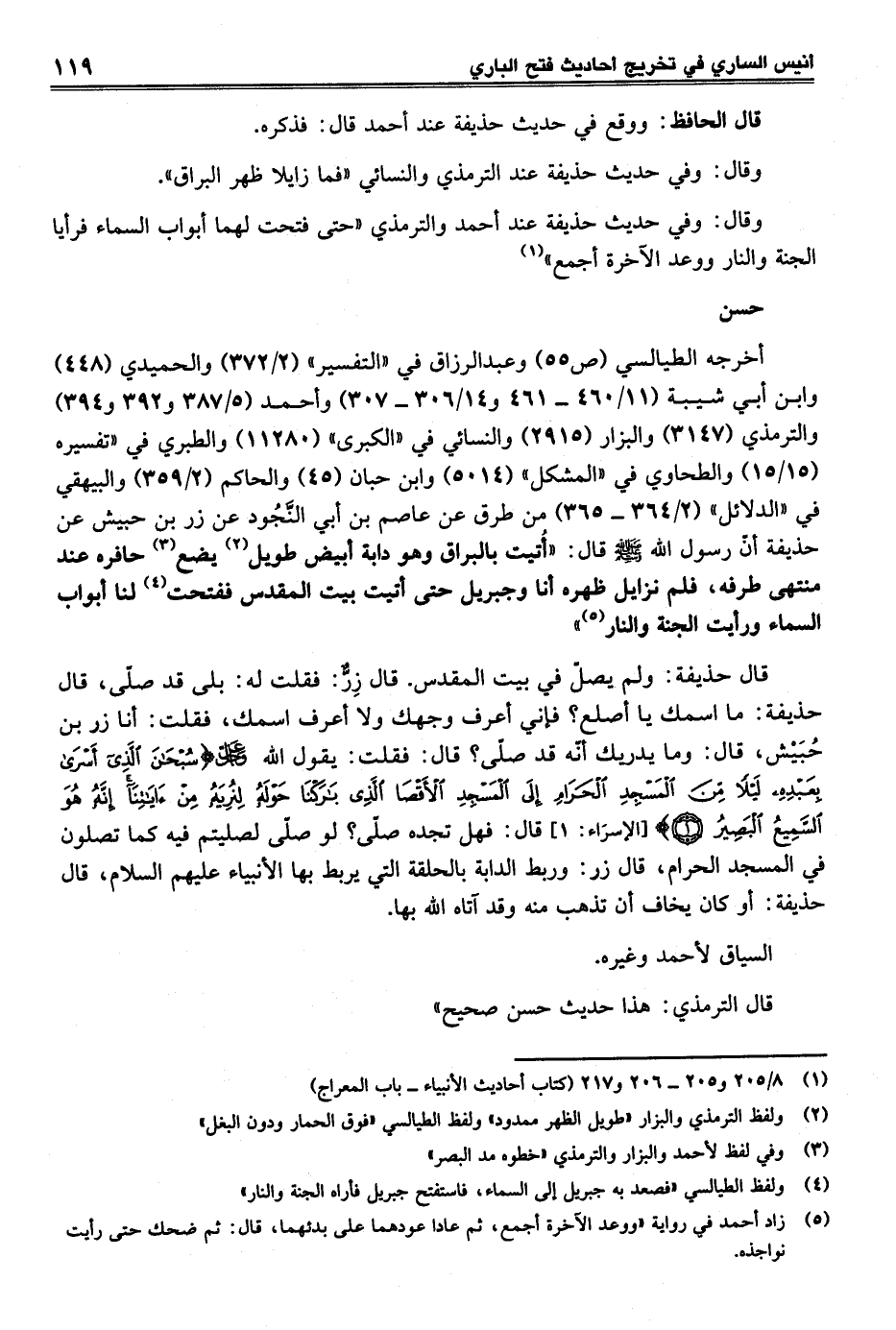 قال حذيفة: ولم يصلّ في بيت المقدس. قال زِرٌّ: فقلت له: بلى قد صلّى، قال حذيفة: ما اسمك يا أصلع؟ فإني أعرف وجهك ولا أعرف اسمك، فقلت: أنا زر بن حُبَيْش، قال: وما يدريك أنّه قد صلى؟ قال: فقلت: يقول الله - عز وجل - ({سُبْحَانَ الَّذِي أَسْرَى بِعَبْدِهِ لَيْلًا مِنَ الْمَسْجِدِ الْحَرَامِ إِلَى الْمَسْجِدِ الْأَقْصَى الَّذِي بَارَكْنَا حَوْلَهُ لِنُرِيَهُ مِنْ آيَاتِنَا إِنَّهُ هُوَ السَّمِيعُ الْبَصِيرُ (1)} [الإسراء: 1] قال: فهل تجده صلّى؟ لو صلّى لصليتم فيه كما تصلون في المسجد الحرام، قال زر: وربط الدابة بالحلقة التي يربط بها الأنبياء عليهم السلام، قال حذيفة: أو كان يخاف أن تذهب منه وقد آتاه الله بها.