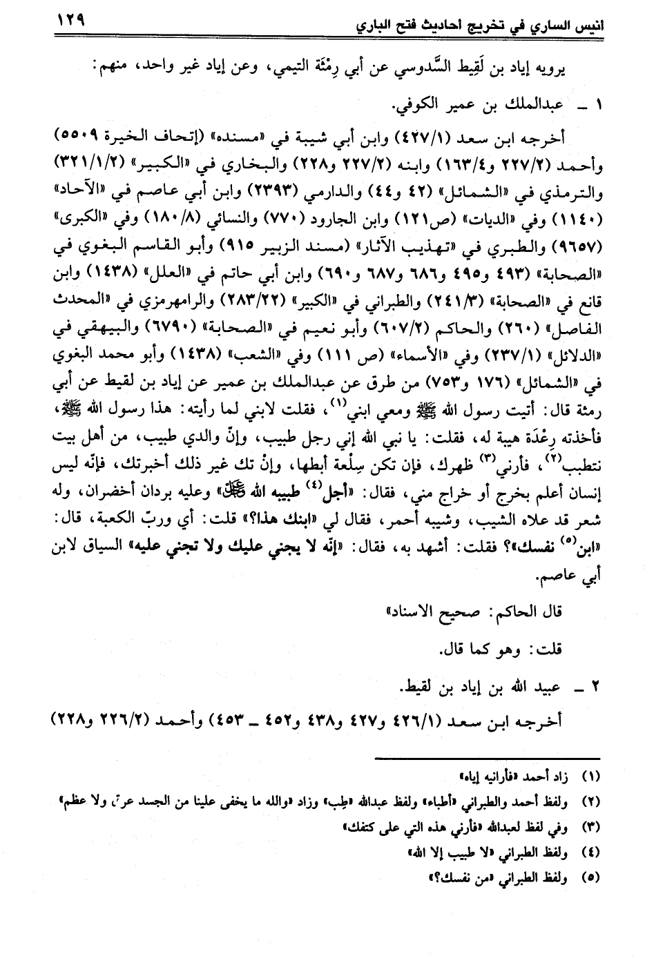 أخرجه ابن سعد (1/ 427) وابن أبي شيبة في "مسنده" (إتحاف الخيرة 5509) وأحمد (2/ 227 و 4/ 163) وابنه (2/ 227 و 228) والبخاري في"الكبير" (2/ 1/ 321) والترمذي في "الشمائل" (42 و 44) والدارمي (2393) وابن أبي عاصم في "الآحاد" (1140) وفي "الديات" (ص 121) وابن الجارود (770) والنسائي (8/ 180) وفي "الكبرى" (9657) والطبري في "تهذيب الآثار" (مسند الزبير 915) وأبو القاسم البغوي في "الصحابة" (493 و 495 و 686 و 687 و 690) وابن أبي حاتم في "العلل" (1438) وابن قانع في "الصحابة" (3/ 241) والطبراني في "الكبير" (22/ 283) والرامهرمزي في "المحدث الفاصل" (260) والحاكم (2/ 607) وأبو نعيم في "الصحابة" (6790) والبيهقي في "الدلائل" (1/ 237) وفي "الأسماء" (ص 111) وفي "الشعب" (1438) وأبو محمد البغوي في "الشمائل" (176 و 753) من طرق عن عبد الملك بن عمير عن إياد بن لقيط عن أبي رمثة قال: أتيت رسول الله - صلى الله عليه وسلم -. ومعي ابني (¬1)، فقلت لابني لما رأيته: هذا رسول الله - صلى الله عليه وسلم -، فأخذته رِعْدَة هيبة له، فقلت: يا نبي الله إني رجل طبيب، وإنّ والدي طبيب، من أهل بيت نتطبب (¬2)، فأرني (¬3) ظهرك، فإن تكن سِلْعة أبطها، وإنْ تك غير ذلك أخبرتك، فإنّه ليس إنسان أعلم بخرج أو خراج مني، فقال: "أجل (¬4) طبيبه الله - عز وجل -" وعليه بردان أخضران، وله شعر قد علاه الشيب، وشيبه أحمر، فقال لي "ابنك هذا؟ " قلت: أي وربّ الكعبة، قال: "ابن (¬5) نفسك"؟ فقلت: أشهد به، فقال: "إنّه لا يجني عليك ولا تجني عليه" السياق لابن أبي عاصم.