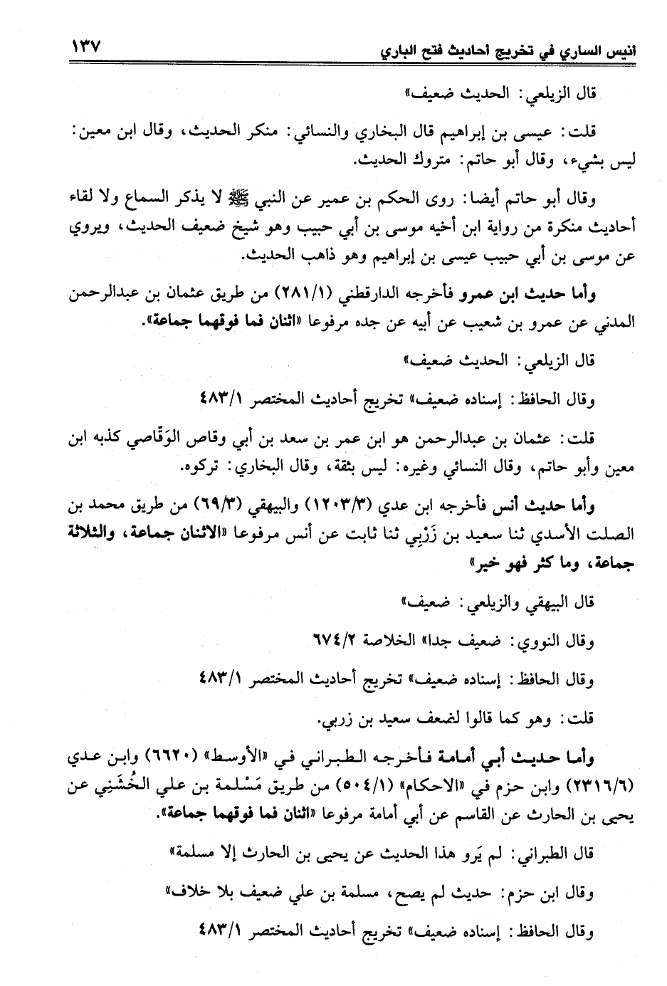 وأما حديث ابن عمرو فأخرجه الدارقطني (1/ 281) من طريق عثمان بن عبد الرحمن المدني عن عمرو بن شعيب عن أبيه عن جده مرفوعا "اثنان فما فوقهما جماعة".