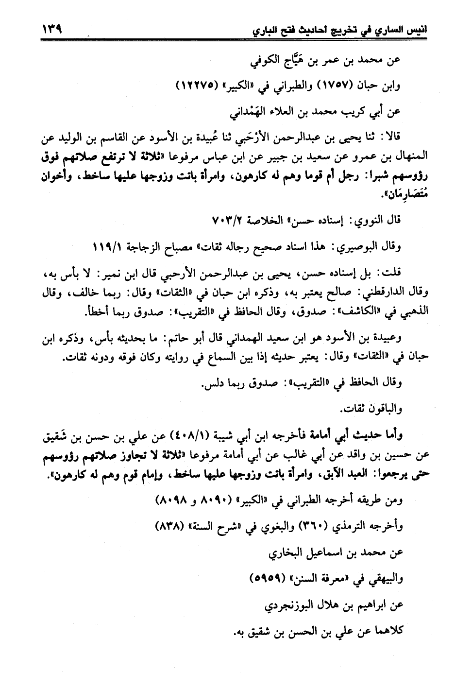 قالا: ثنا يحيى بن عبد الرحمن الأرْحَبي ثنا عُبيدة بن الأسود عن القاسم بن الوليد عن المنهال بن عمرو عن سعيد بن جبير عن ابن عباس مرفوعا "ثلاثة لا ترتفع صلاتهم فوق رؤوسهم شبرا: رجل أم قوما وهم له كارهون، وامرأة باتت وزوجها عليها ساخط، وأخوان مُتَصَارِمَان".