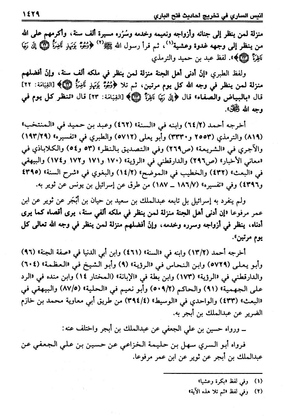 ولفظ الطبري "إنّ أدنى أهل الجنة منزلة لمن ينظر في ملكه ألف سنة، وان أفضلهم منزلة لمن ينظر في وجه الله كل يوم مرتين، ثم تلا: {وُجُوهٌ يَوْمَئِذٍ نَاضِرَةٌ (22)} [القِيَامَة: 22] قال "بالبياض والصفاء" قال {إِلَى رَبِّهَا نَاظِرَةٌ (23)} [القيامة: 23] قال "تنظر كل يوم في وجه الله - عَزَّ وَجَلَّ -".