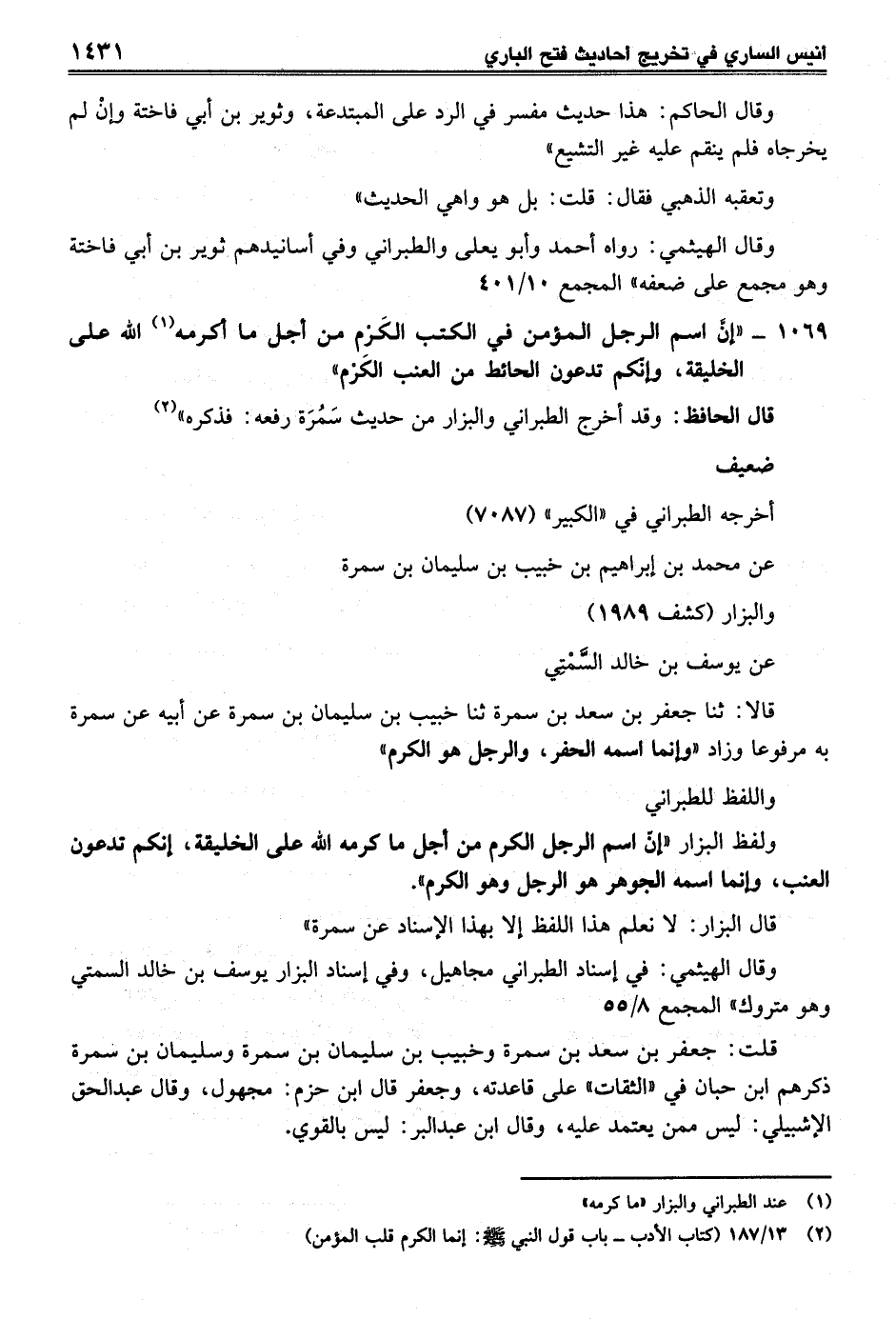1069 - "إنّ اسم الرجل المؤمن في الكتب الكَرْم من أجل ما أكرمه (¬1) الله على الخليقة، وإنّكم تدعون الحائط من العنب الكَرْم"