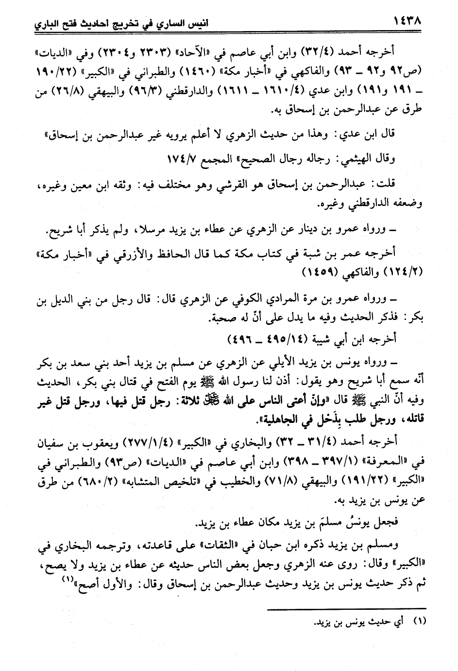 - ورواه يونس بن يزيد الأيلي عن الزهري عن مسلم بن يزيد أحد بني سعد بن بكر أنّه سمع أبا شريح وهو يقول: أذن لنا رسول الله - صلى الله عليه وسلم - يوم الفتح في قتال بني بكر، الحديث وفيه أنّ النبي - صلى الله عليه وسلم - قال "وإنّ أعتى الناس على الله - عَزَّ وَجَلَّ - ثلاثة: رجل قتل فيها، ورجل قتل غير قاتله، ورجل طلب بِذَحْل في الجاهلية".