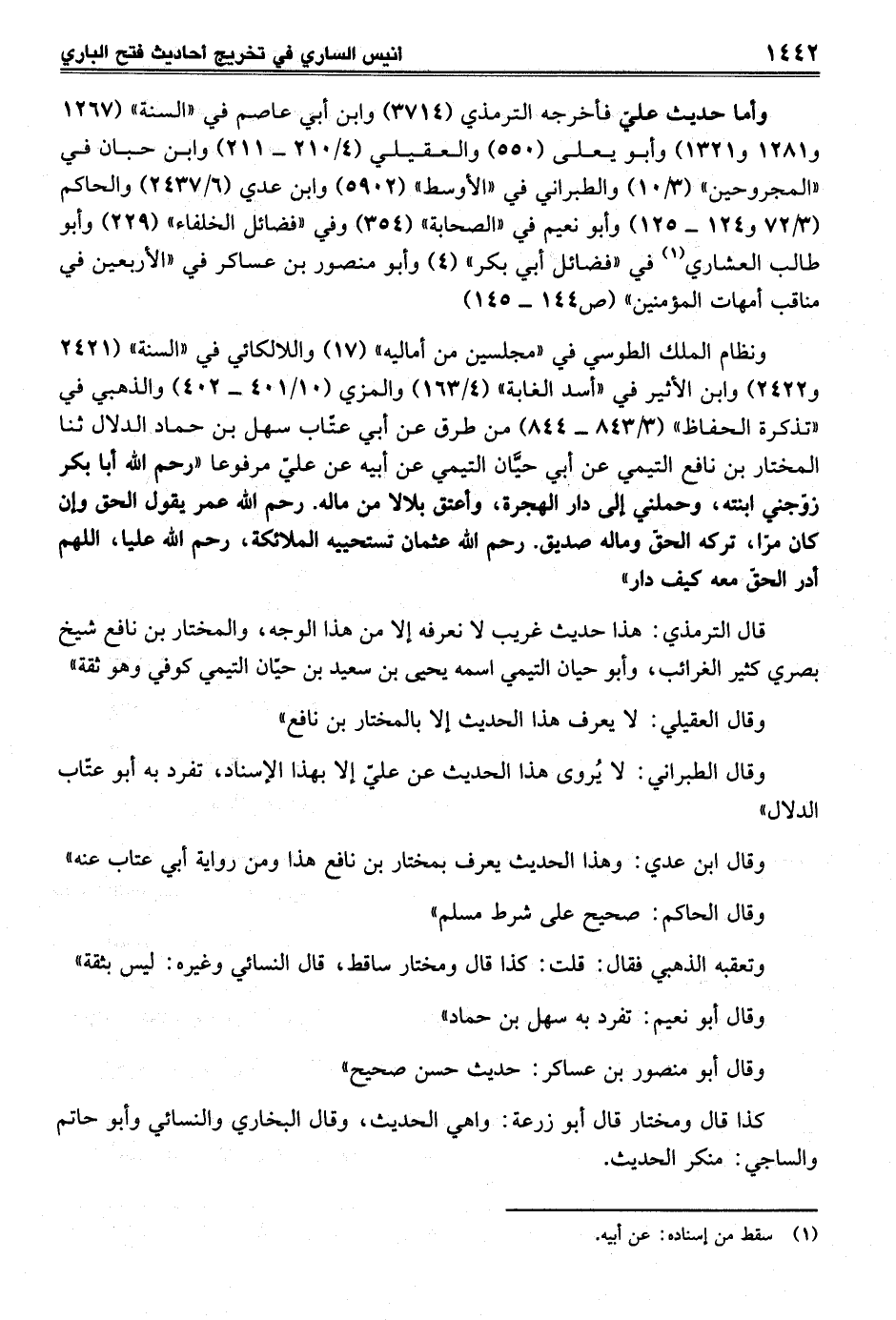 ونظام الملك الطوسي في "مجلسين من أماليه" (17) واللالكائي في "السنة" (2421 و 2422) وابن الأثير في "أسد الغابة" (4/ 163) والمزي (10/ 401 - 402) والذهبي في "تذكرة الحفاظ" (3/ 843 - 844) من طرق عن أبي عتاب سهل بن حماد الدلال ثنا المختار بن نافع التيمي عن أبي حيَّان التيمي عن أبيه عن علي مرفوعا "رحم الله أبا بكر زوَّجني ابنته، وحملني إلى دار الهجرة، وأعتق بلالاً من ماله. رحم الله عمر يقول الحق وإن كان مرّا، تركه الحقّ وماله صديق. رحم الله عثمان تستحييه الملائكة، رحم الله عليا، اللهم أدر الحقّ معه كيف دار"
